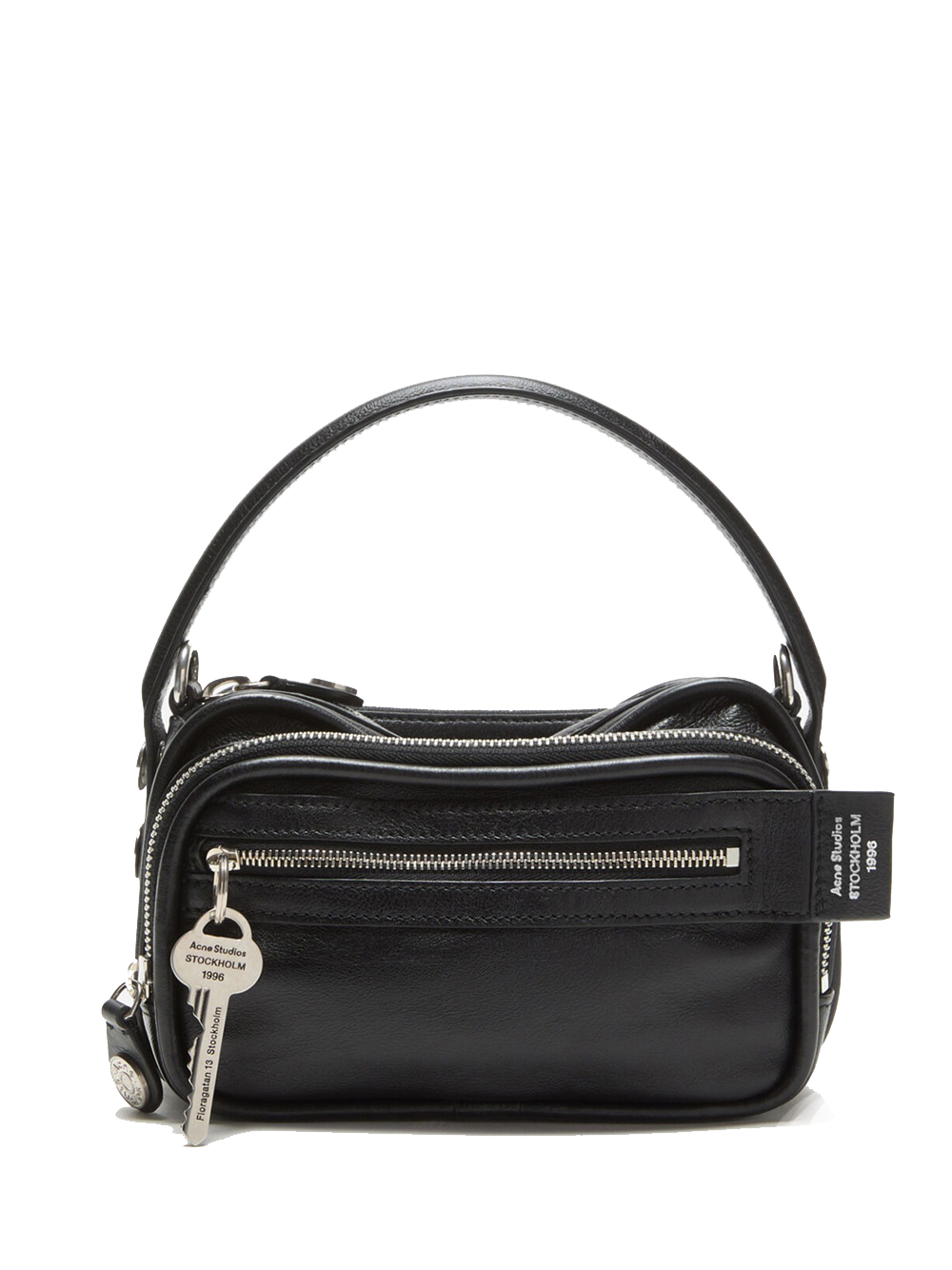 Camero Kit crossbody bag by Acne Studios in leather with teardrop handle, adjustable shoulder strap, soft rectangular design, multiple zippered compartments, branded key ring, and denim-style button logo details.
