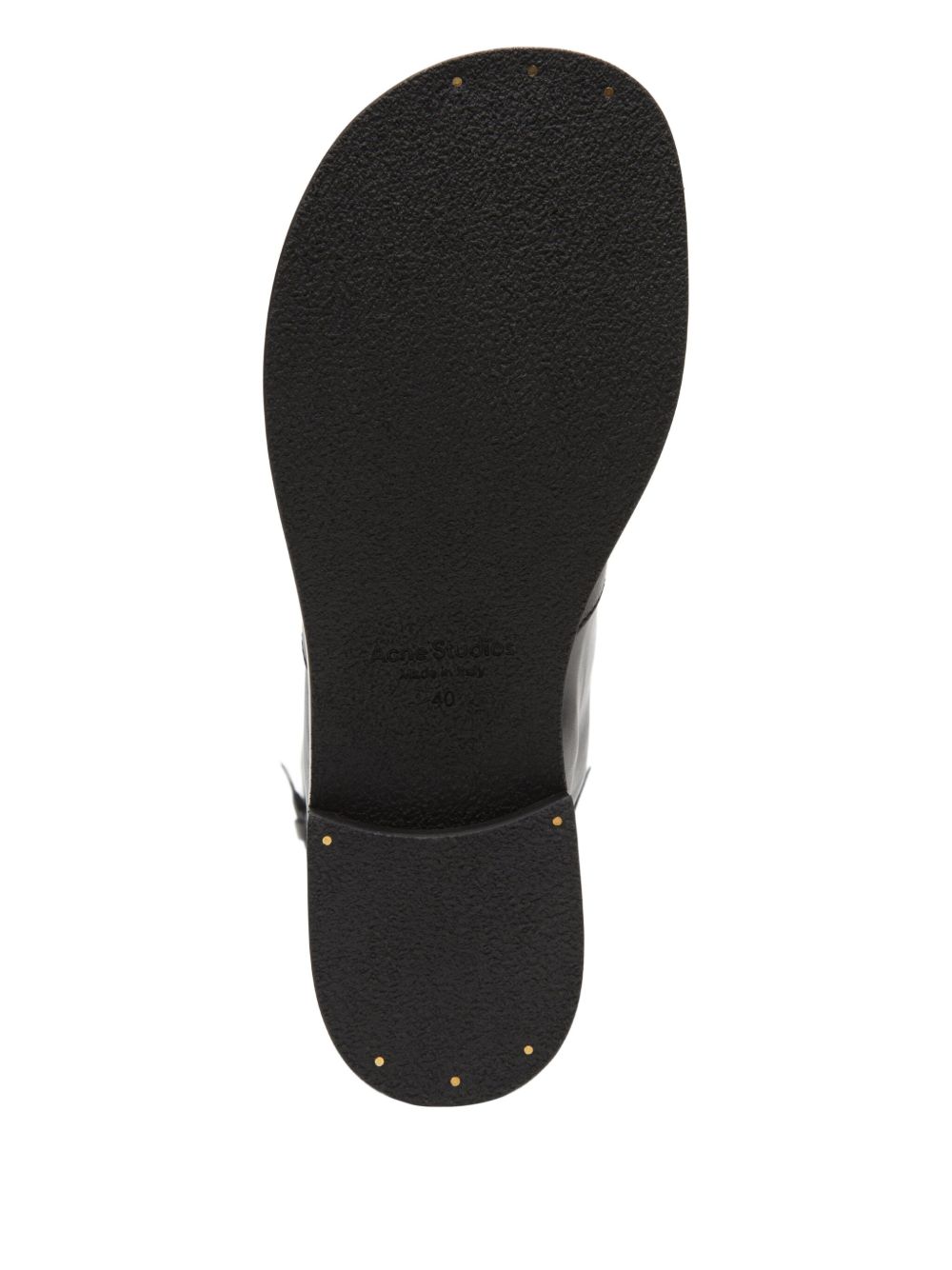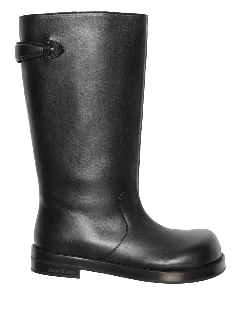 Black leather boots by Acne Studios with strap detail, round toe, and rubber sole.