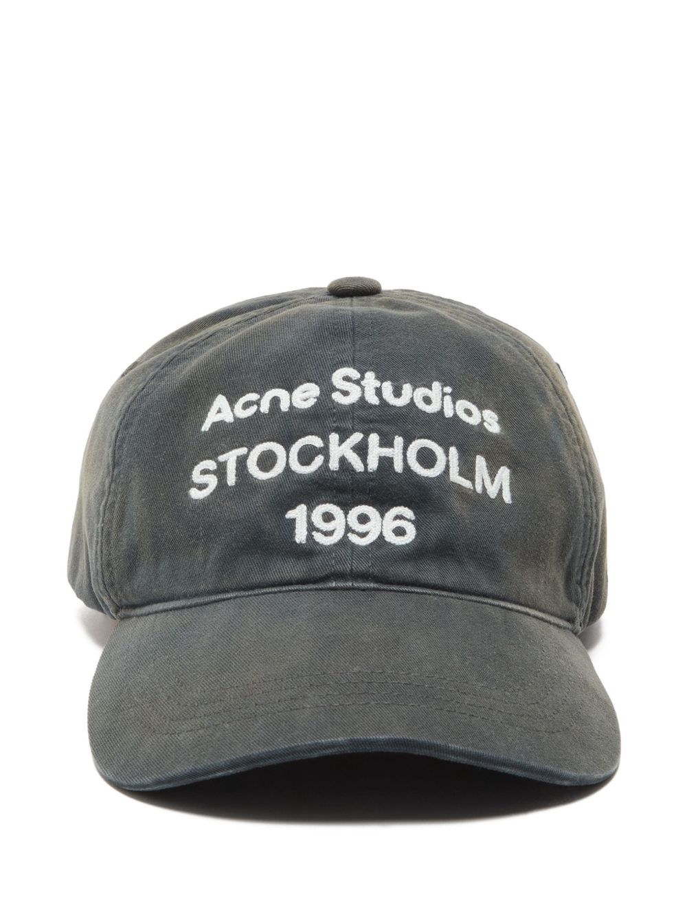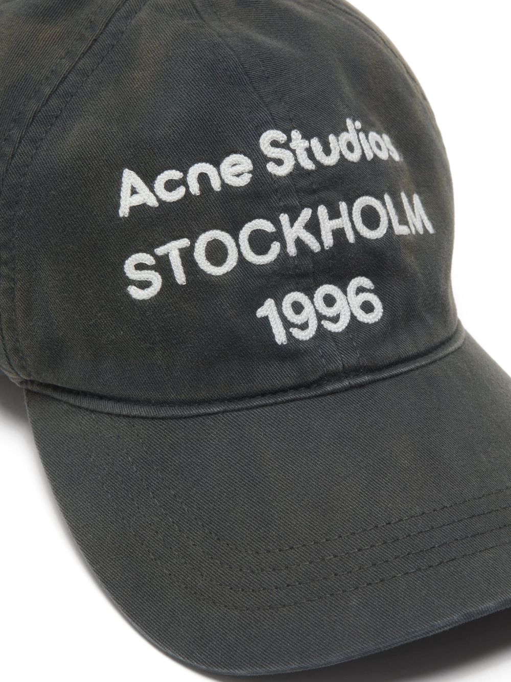 White cotton hat by Acne Studios with curved brim, embroidered logo on the front, and adjustable closure at the back.