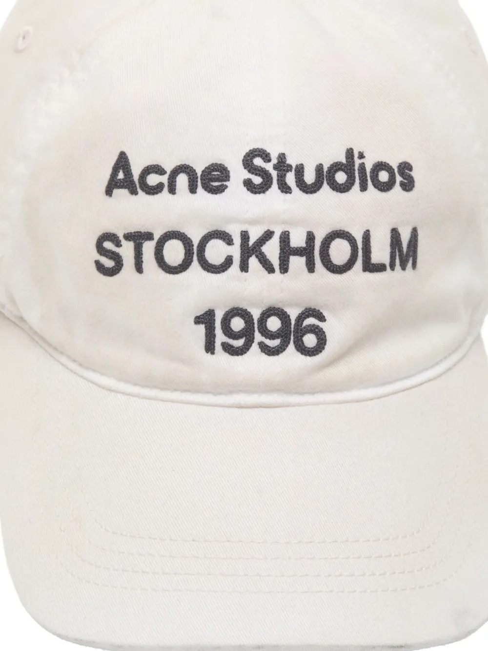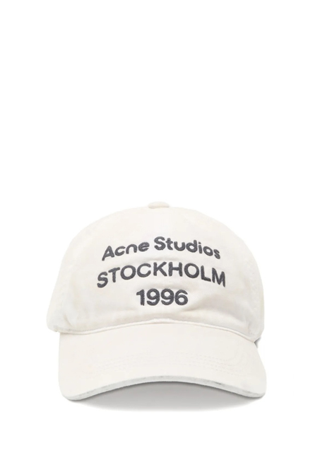 White cotton hat by Acne Studios with curved brim, embroidered logo on the front, and adjustable closure at the back.