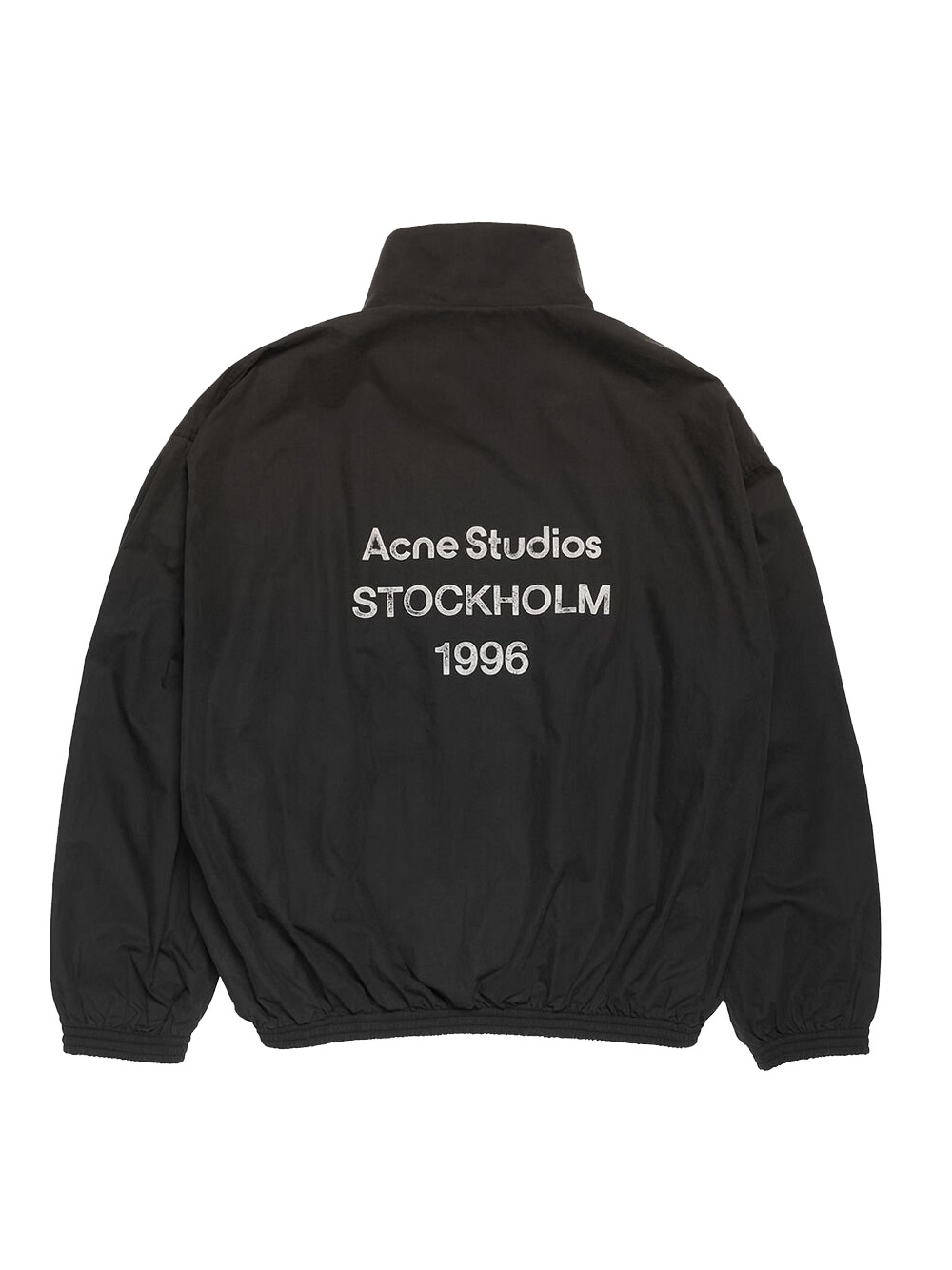 Black nylon jacket by Acne Studios with Acne Studios logo embroidery on the back, relaxed fit, and below-the-waist length.