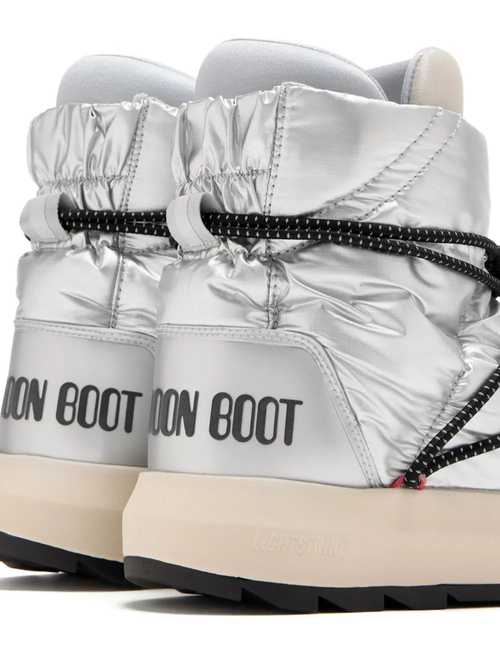 Silver Adidas x Moon Boot Ace boots in fabric with quilted design, lace-up closure, padded upper, rubber sole, and lettering logo.