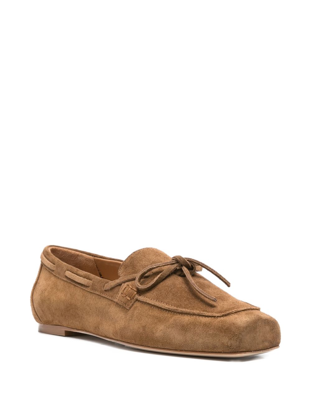 Jasper tobacco loafers by Aeyde in suede with square toe, slip-on style, bow detail, and flat sole.
