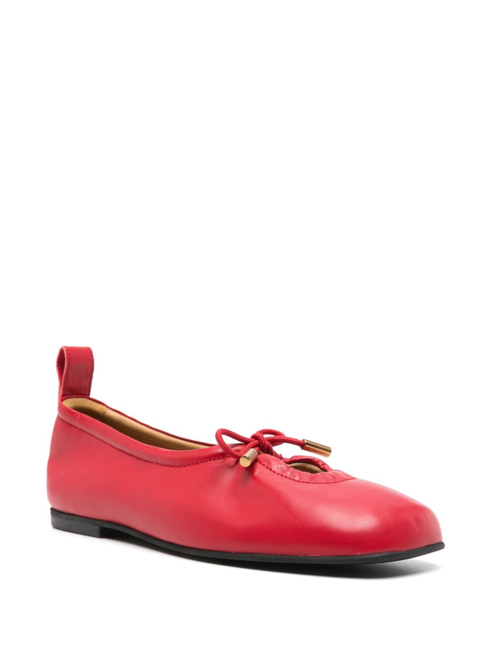 Rosalind red leather ballet flats by Alohas with square toe, bow, heel tab, and low laminated heel.