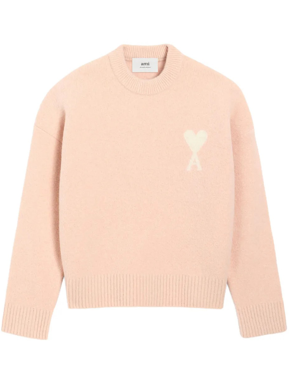 ADC powder pink sweater by Ami Paris in alpaca with crew neck, contrasting red logo, and straight hem.
