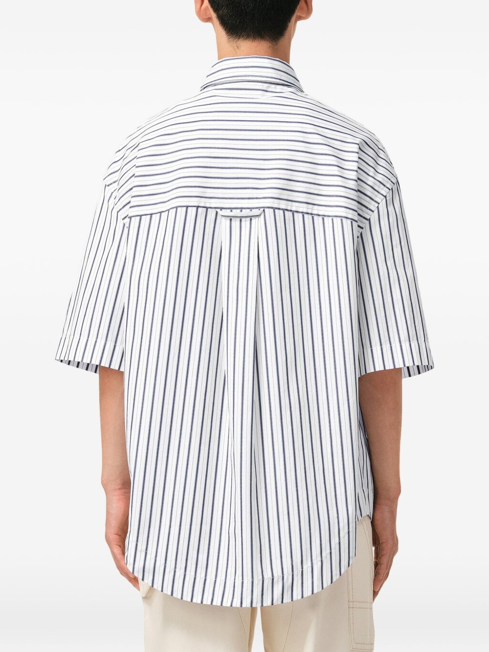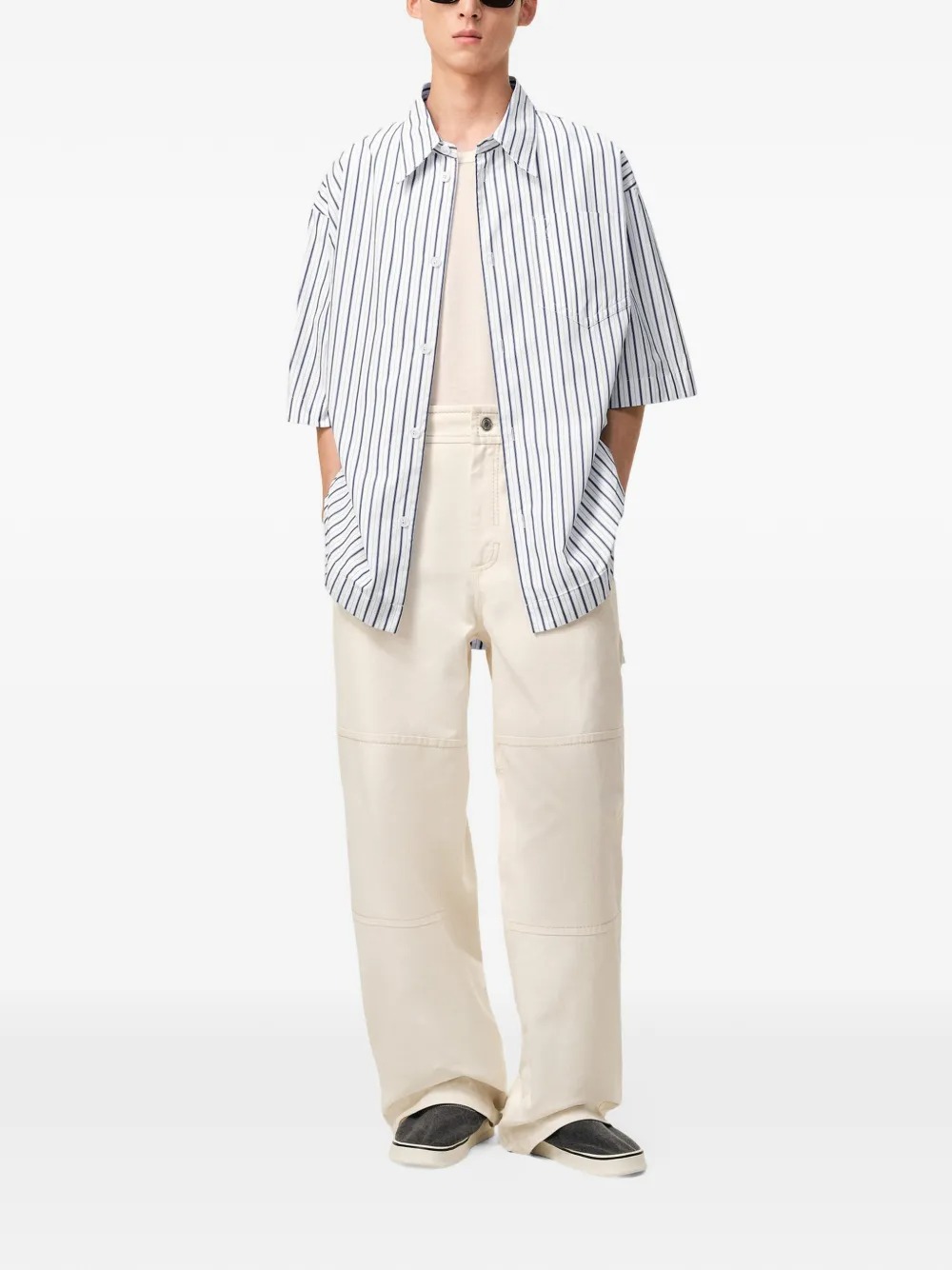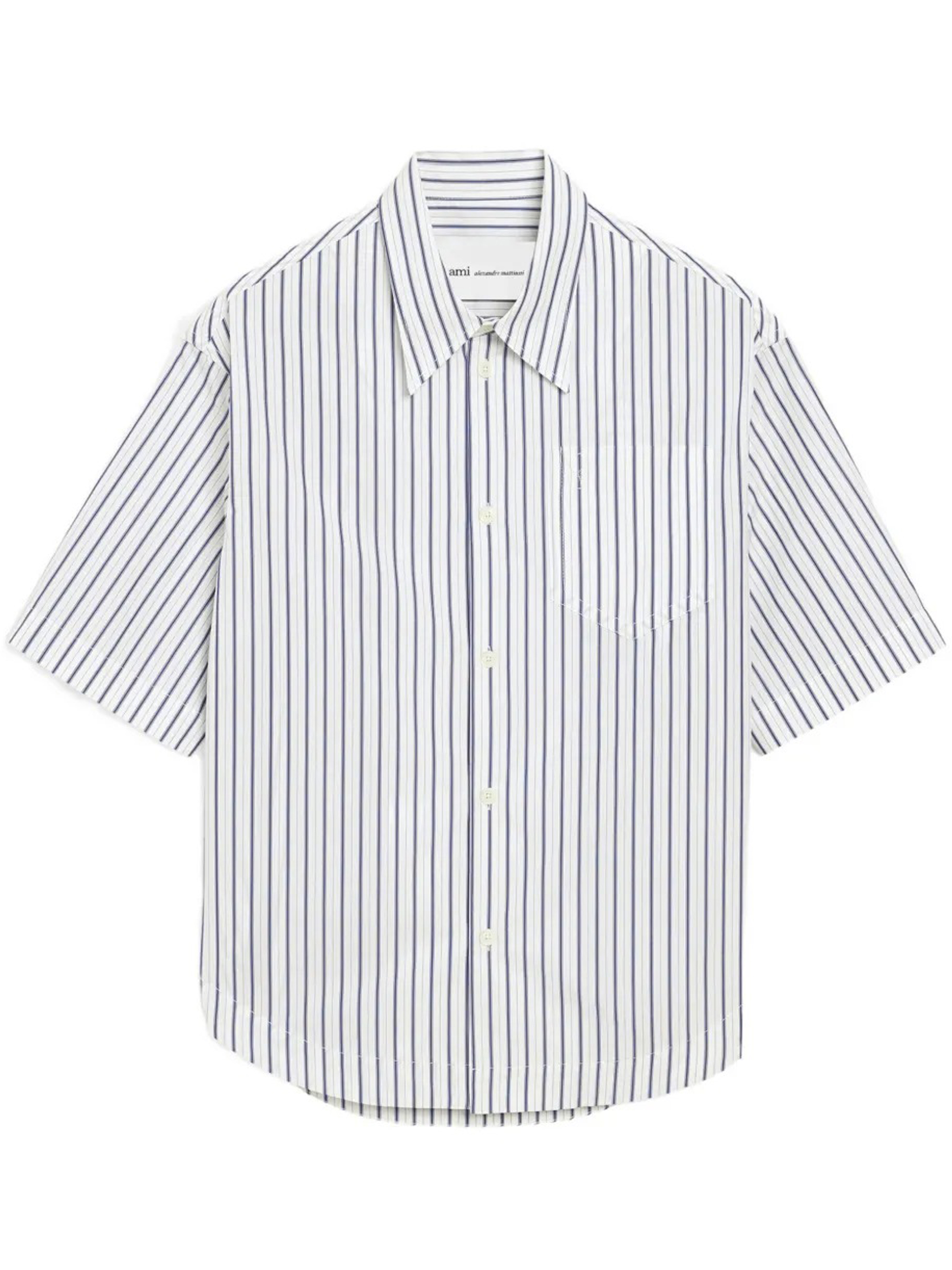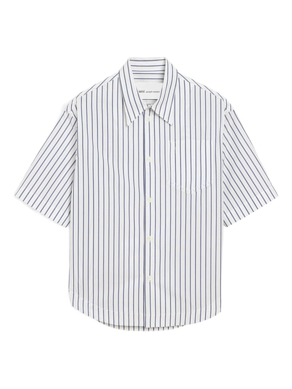Ami Paris "Embrossed ADC" white and blue cotton shirt with a striped pattern, pointed collar, chest pocket, short sleeves, and a button-down front closure.