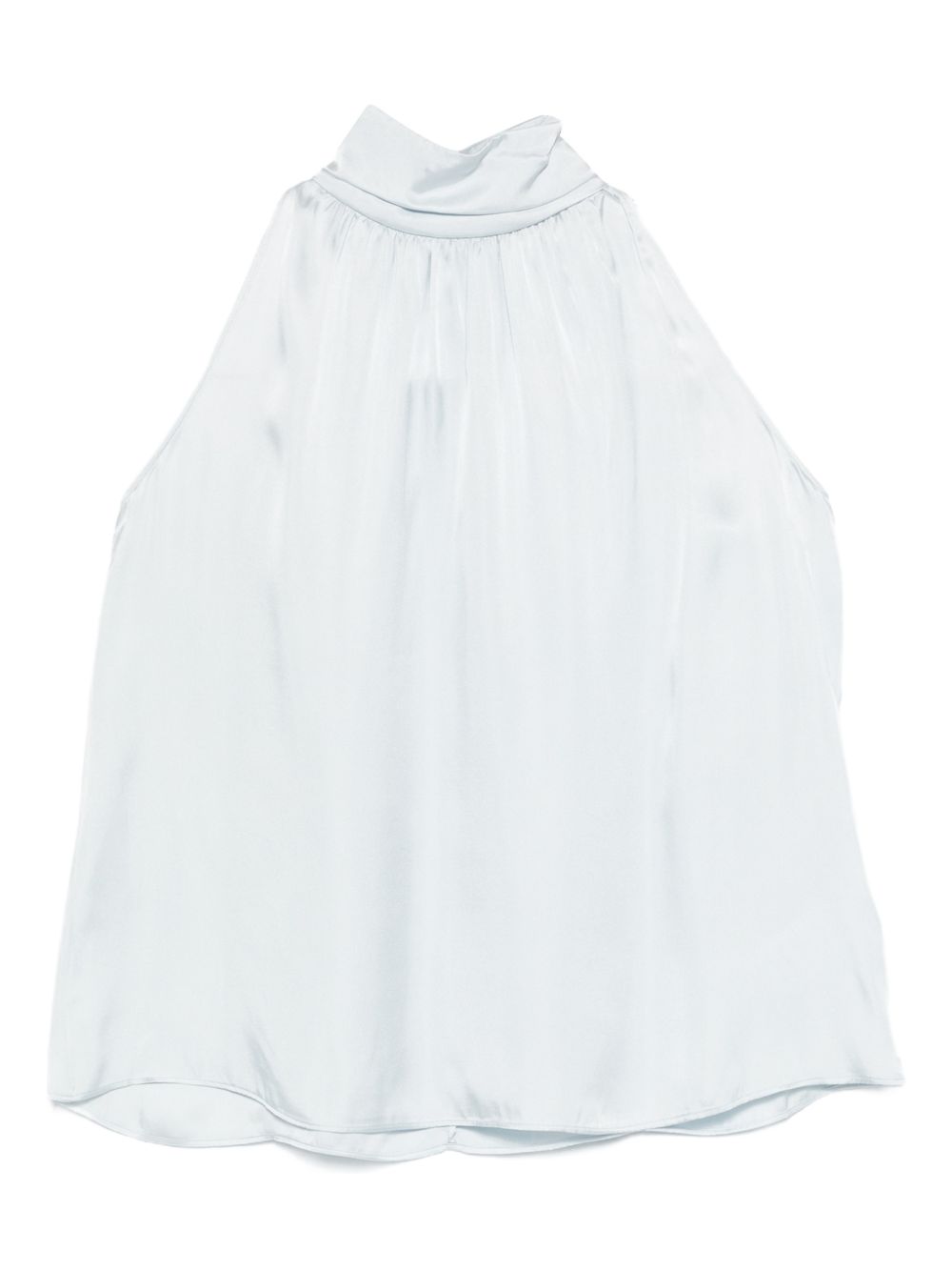 Marie blue silk top by Anine Bing with high neck, button closure at the back, and straight hem.