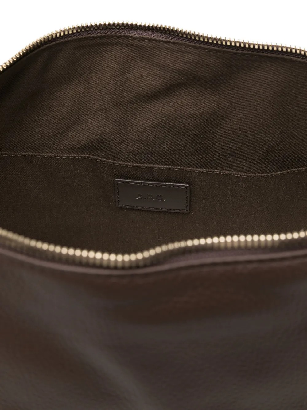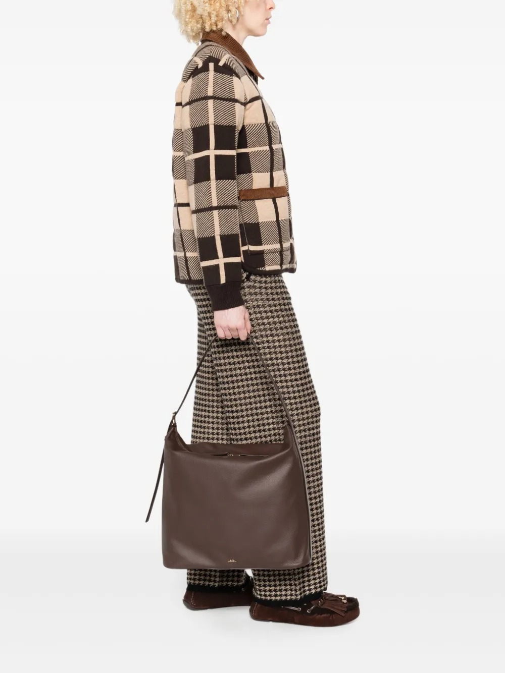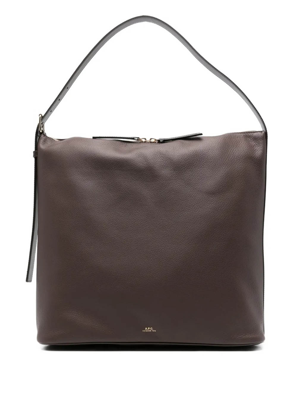 Vera Maxi brown leather bag by A.P.C. with adjustable handle, double-slider zip closure, and contrasting logo.
