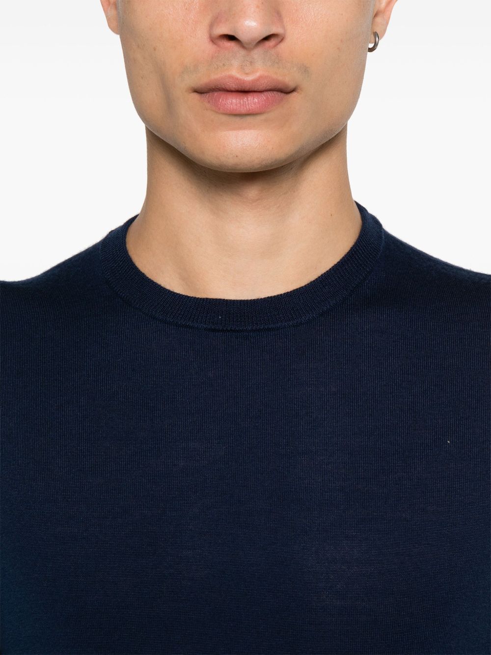 Navy Mod. M195 wool knitweater by Aspesi with ribbed knit, crew neck, long sleeves, ribbed hem and cuffs.