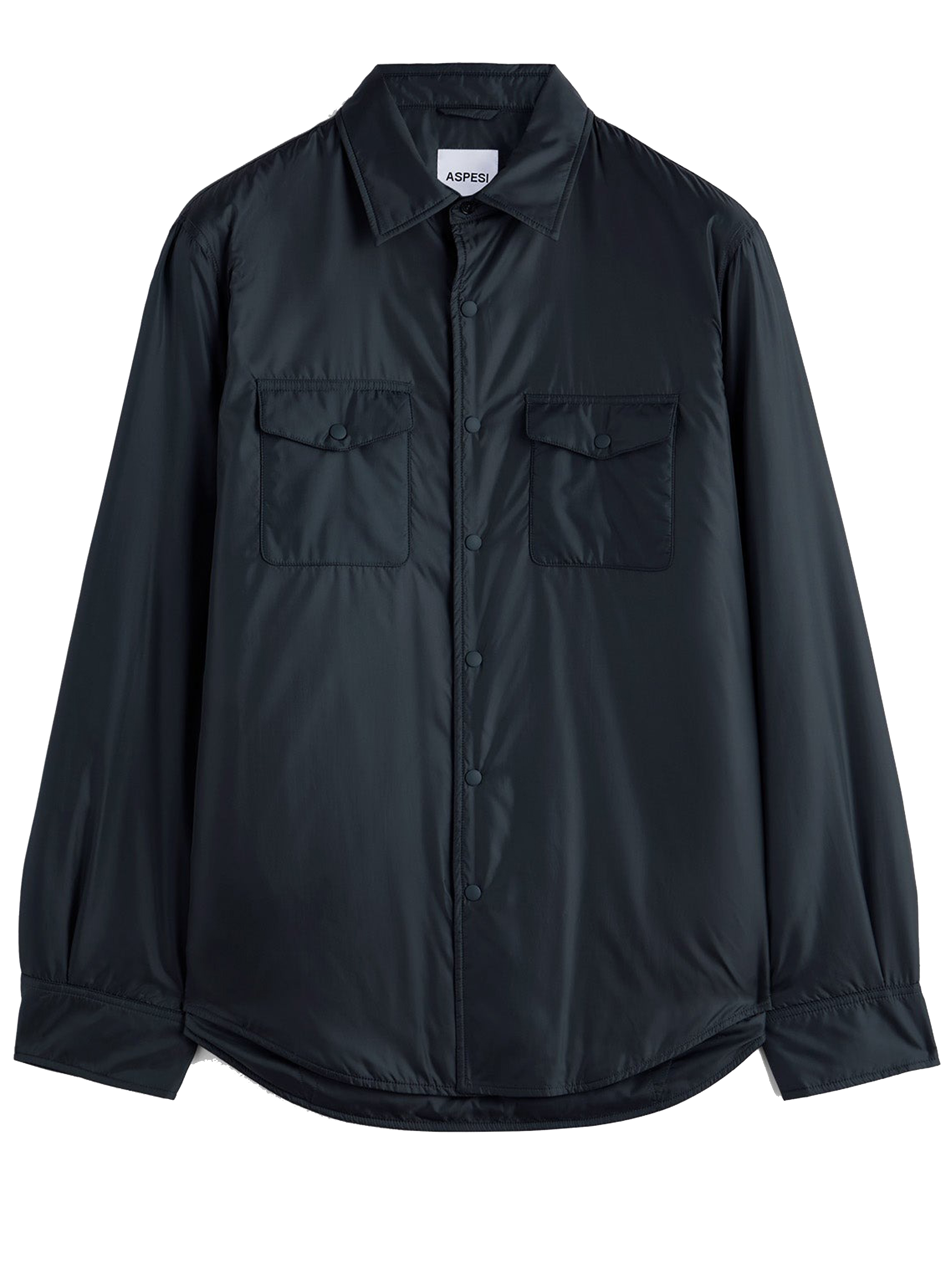 Navy shirt by Aspesi in polyamide with classic collar, two front pockets with snap buttons, padded design, buttoned cuffs, front button closure and rounded hem.