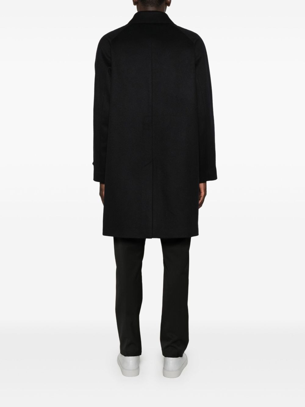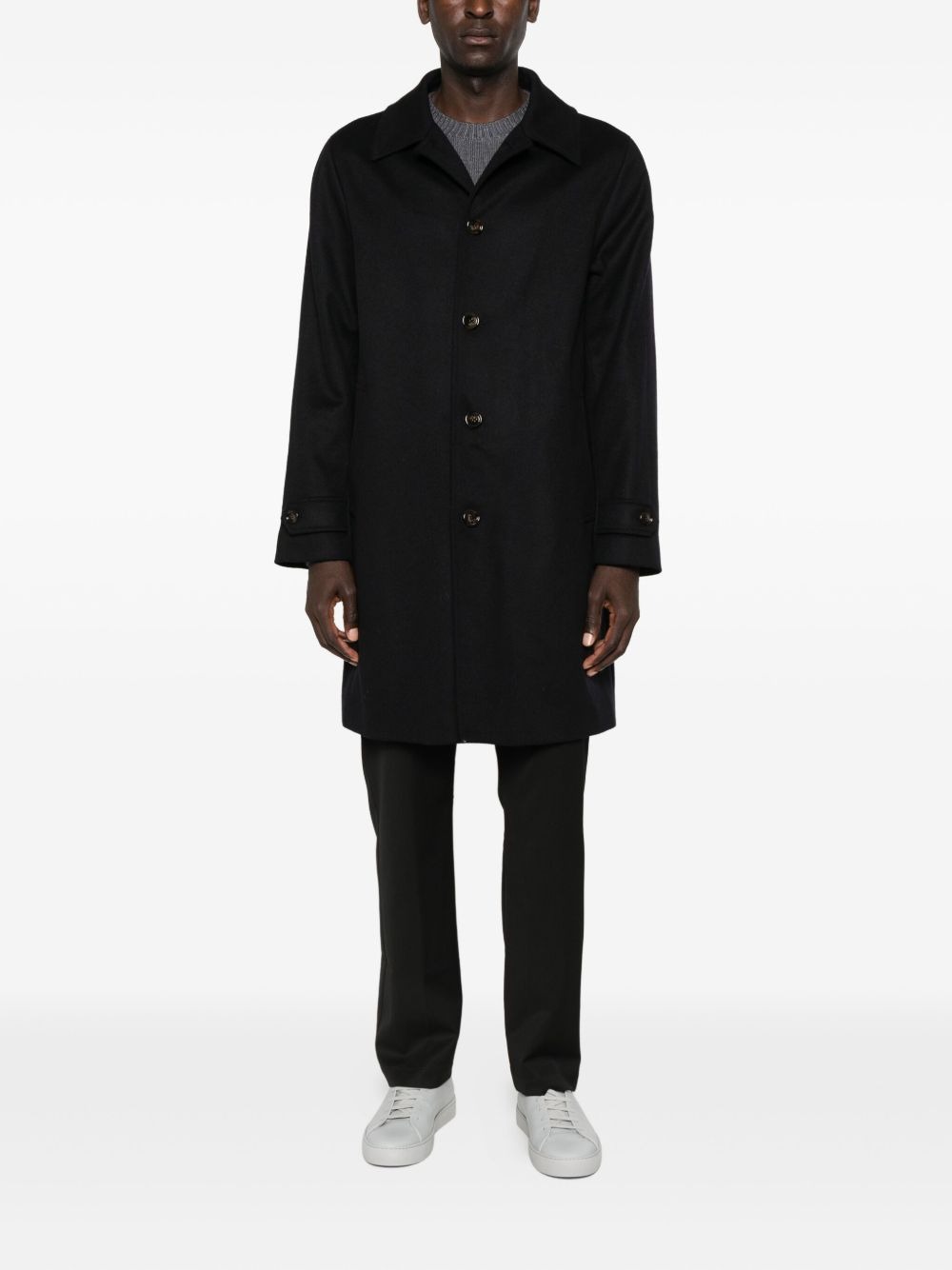 Pascal navy wool coat by Aspesi with button closure, classic collar, front pockets, and straight hem.