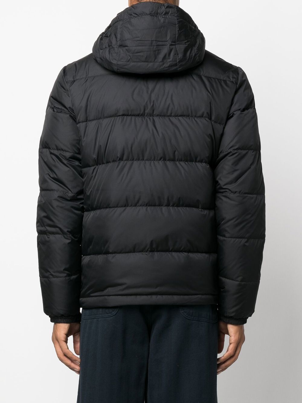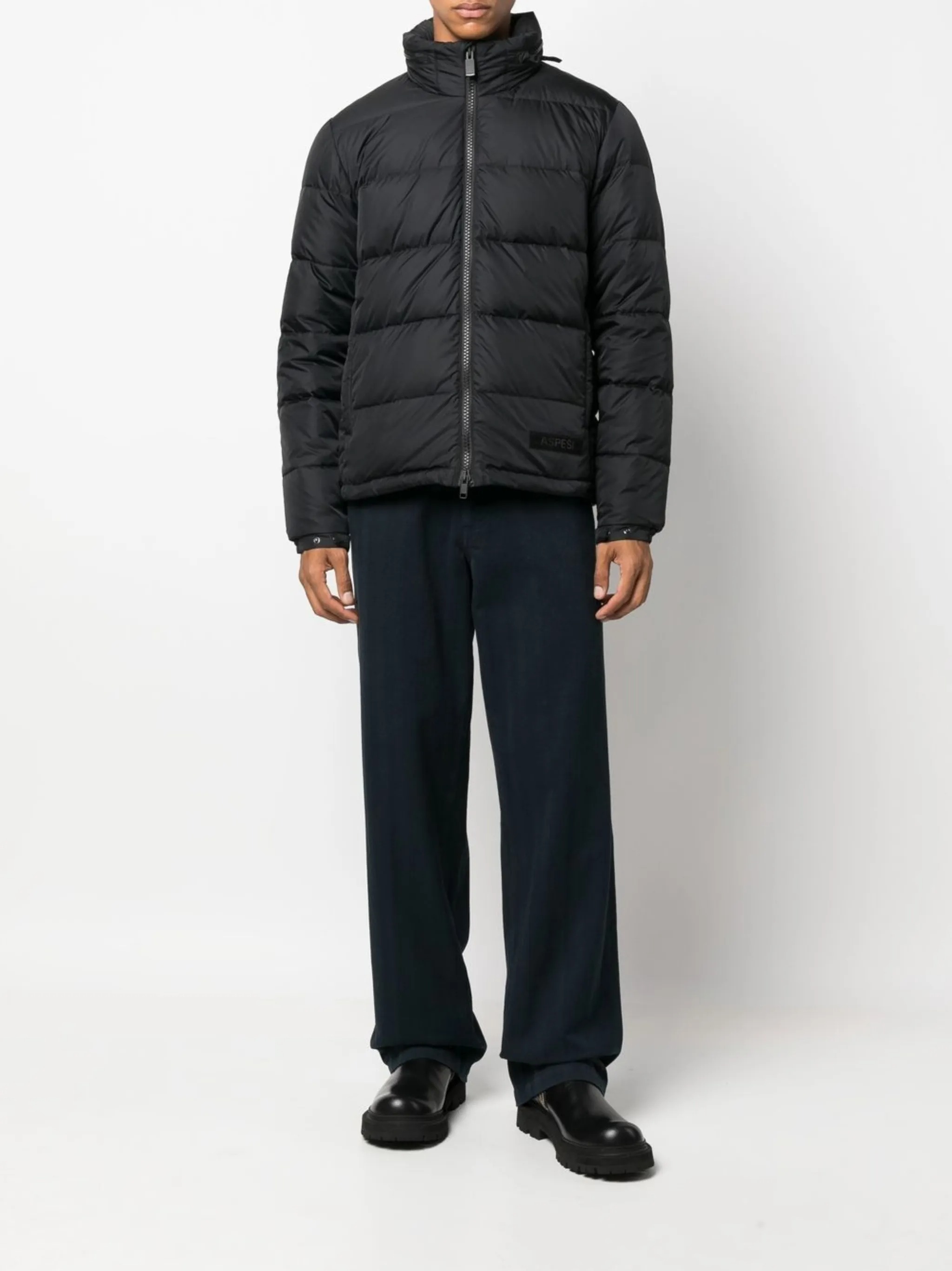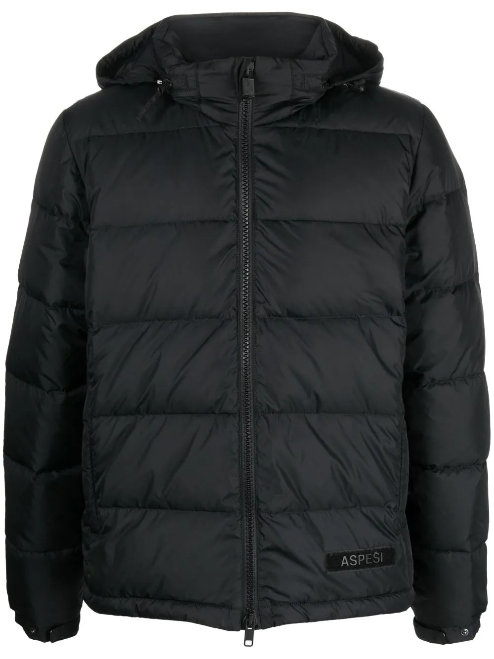 Polyester Pocoelastica Re-Quilted black down jacket by Aspesi featuring a hood, front zipper closure, side welt pockets and straight hem.