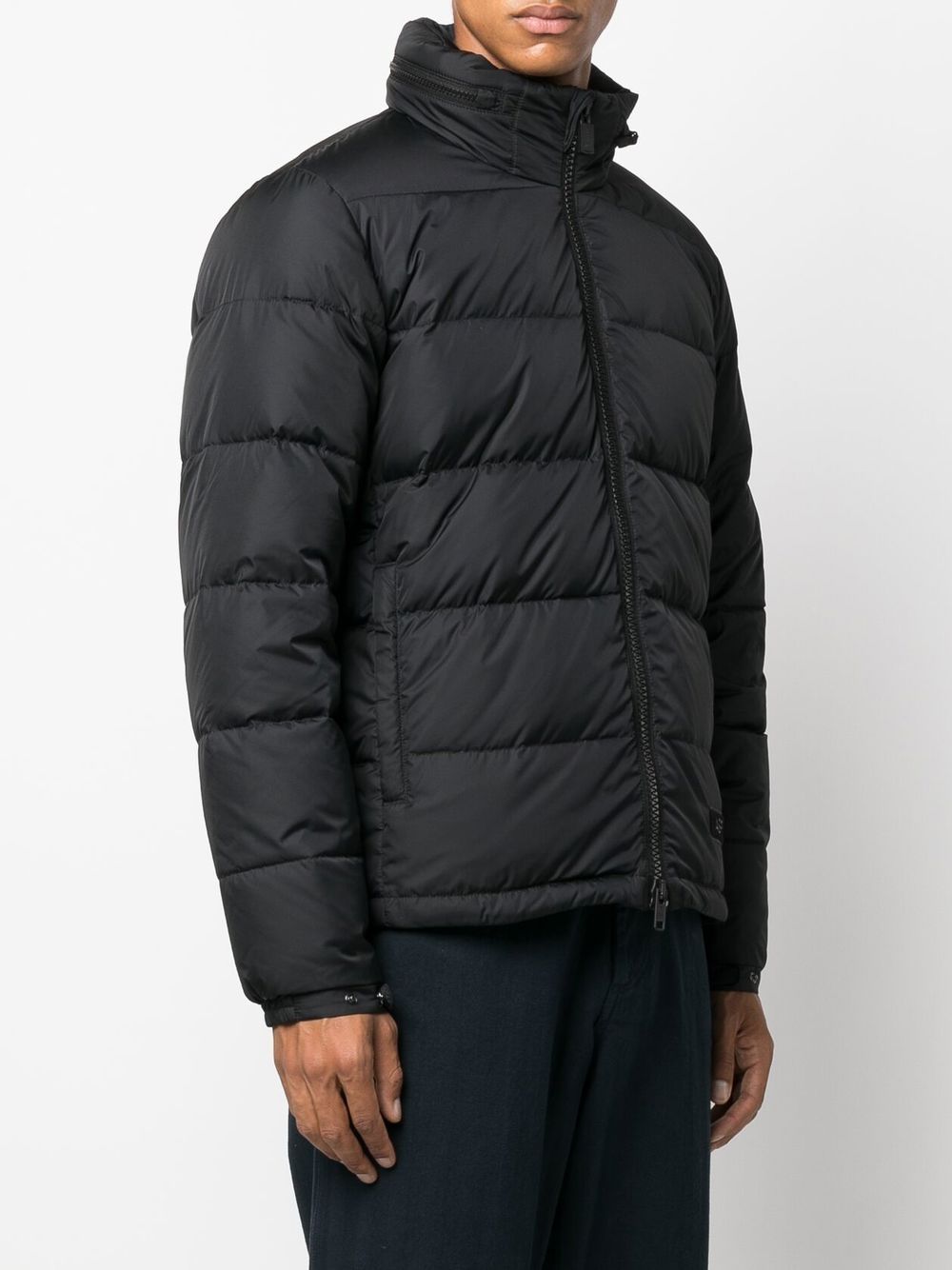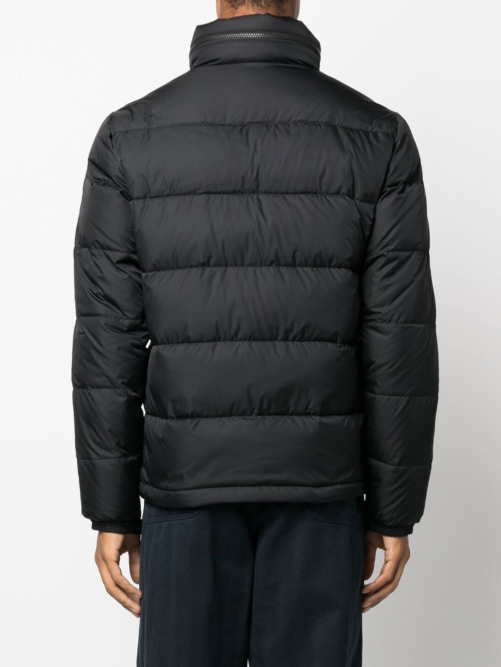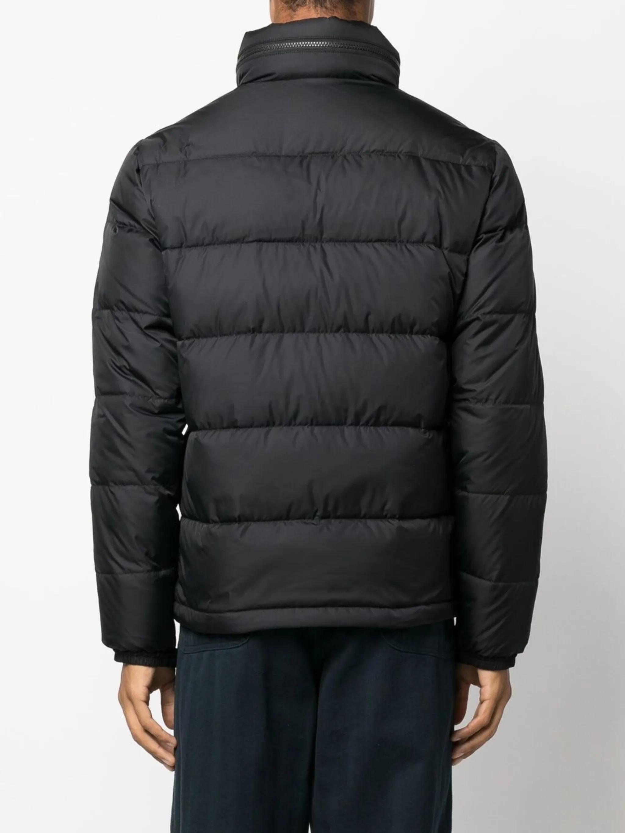 Polyester Pocoelastica Re-Quilted black down jacket by Aspesi featuring a hood, front zipper closure, side welt pockets and straight hem.