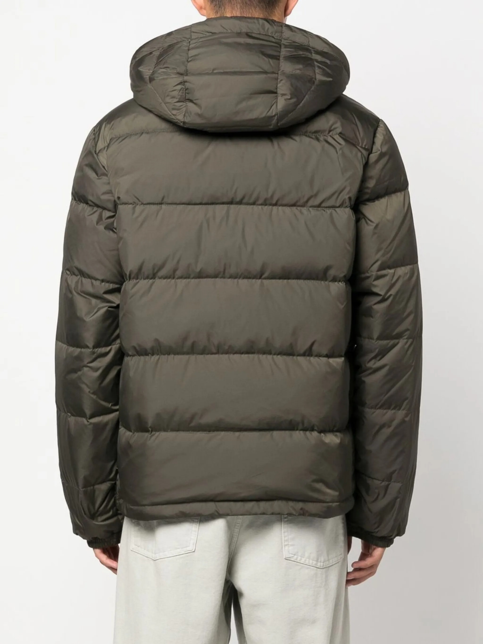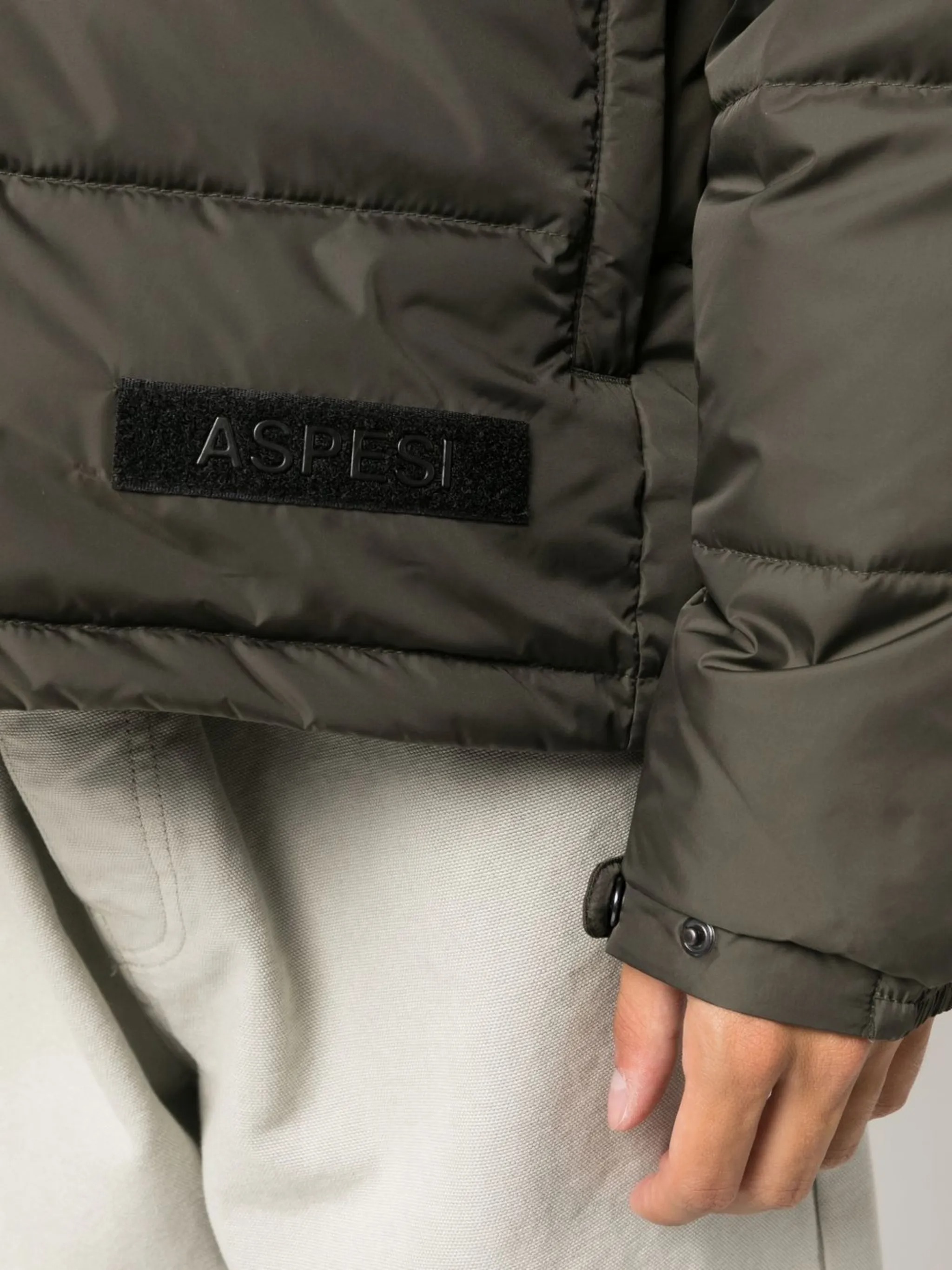 Polyester Pocoelastica Re-Quilted green down jacket by Aspesi featuring a hood, front zipper closure, side welt pockets and straight hem.