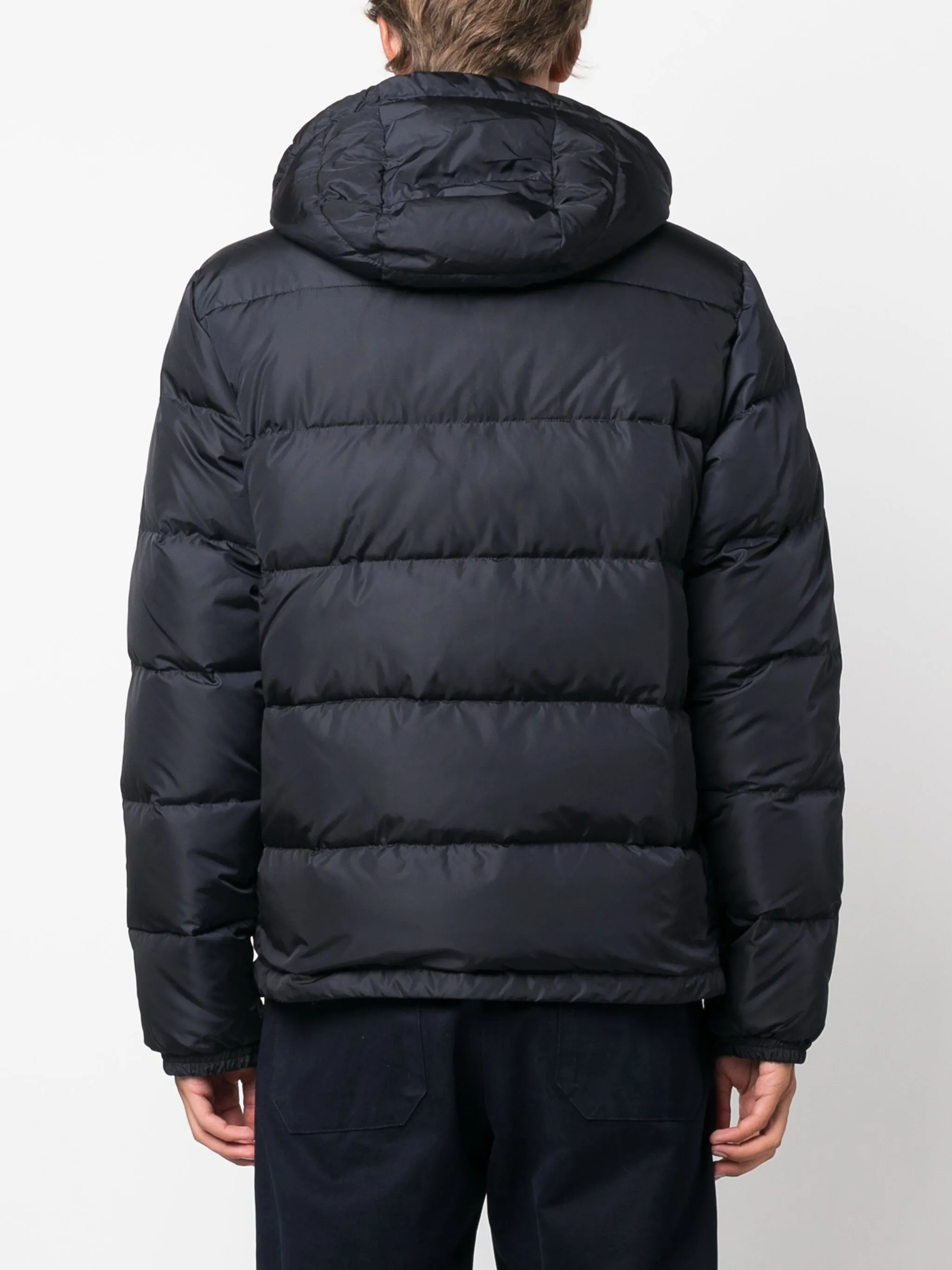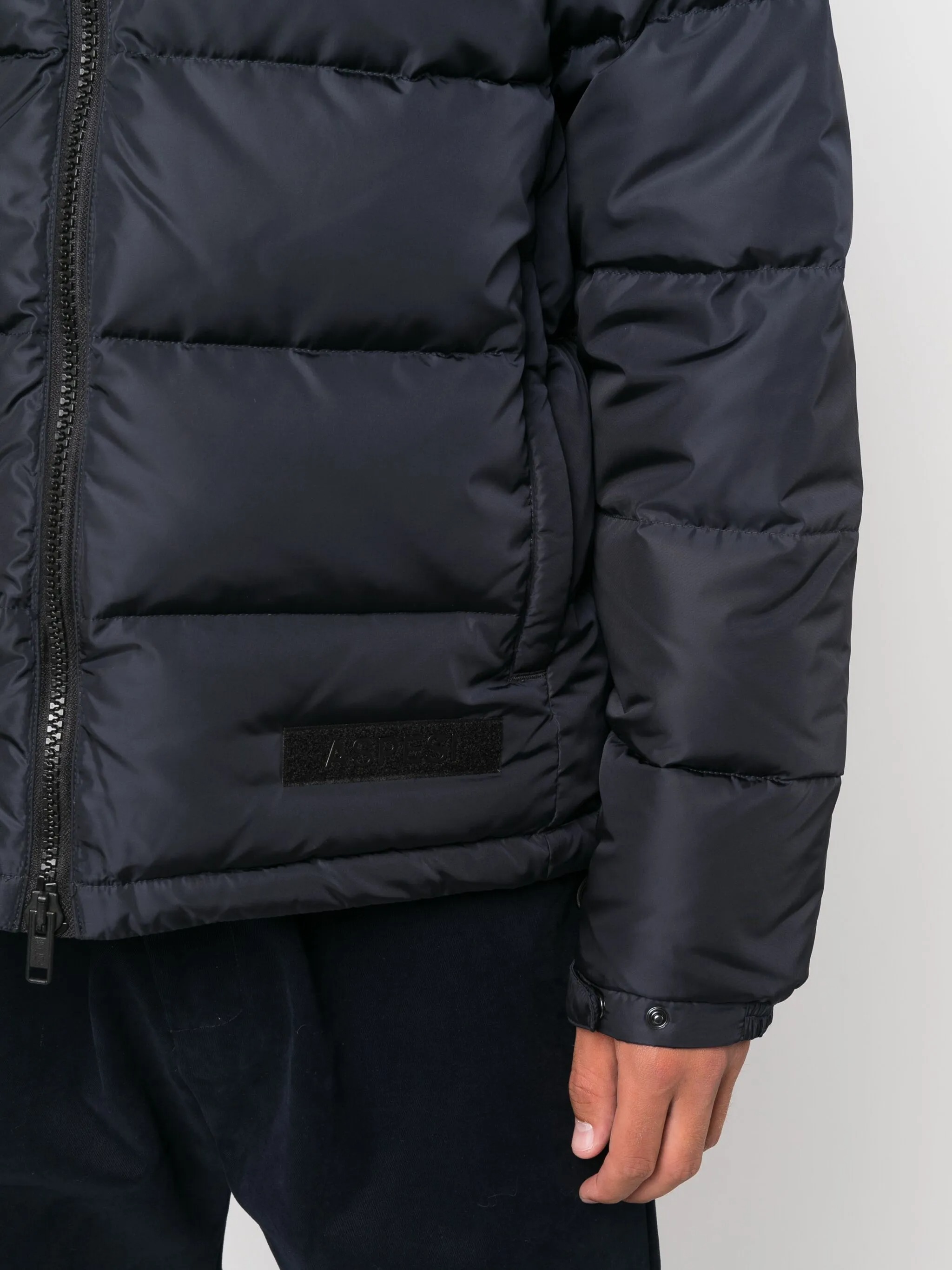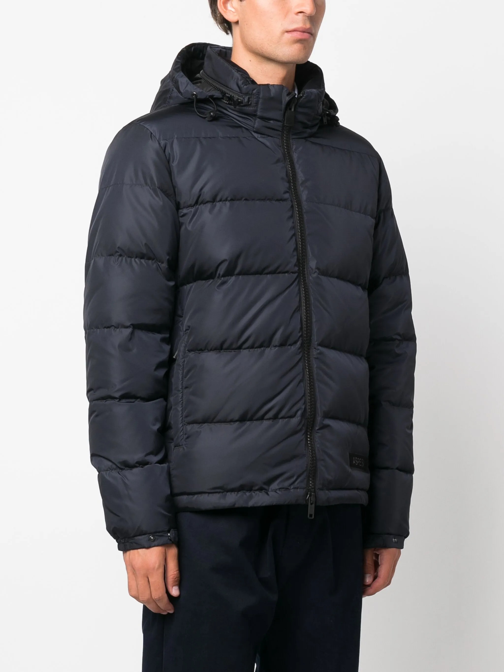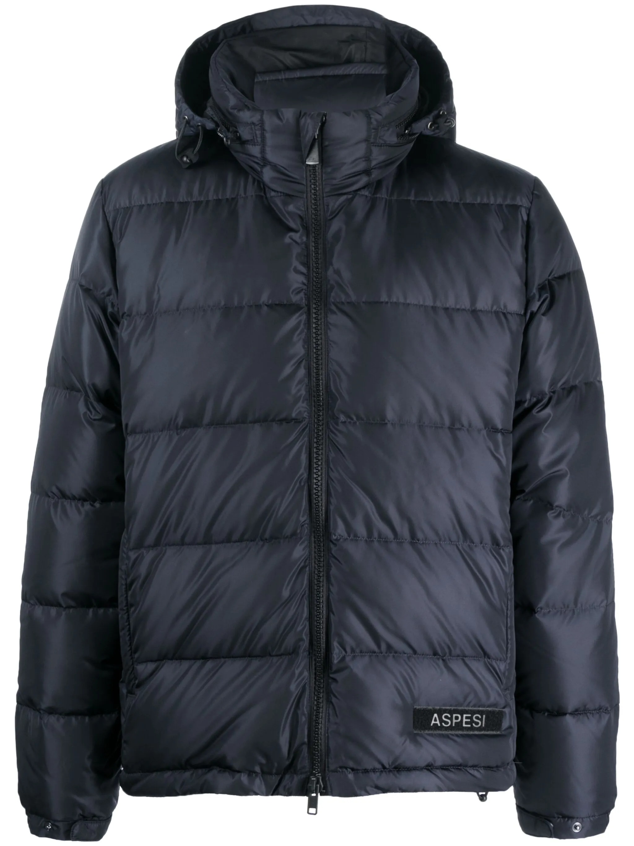 Polyester Pocoelastica Re-Quilted navy down jacket by Aspesi featuring a hood, front zipper closure, side welt pockets and straight hem.