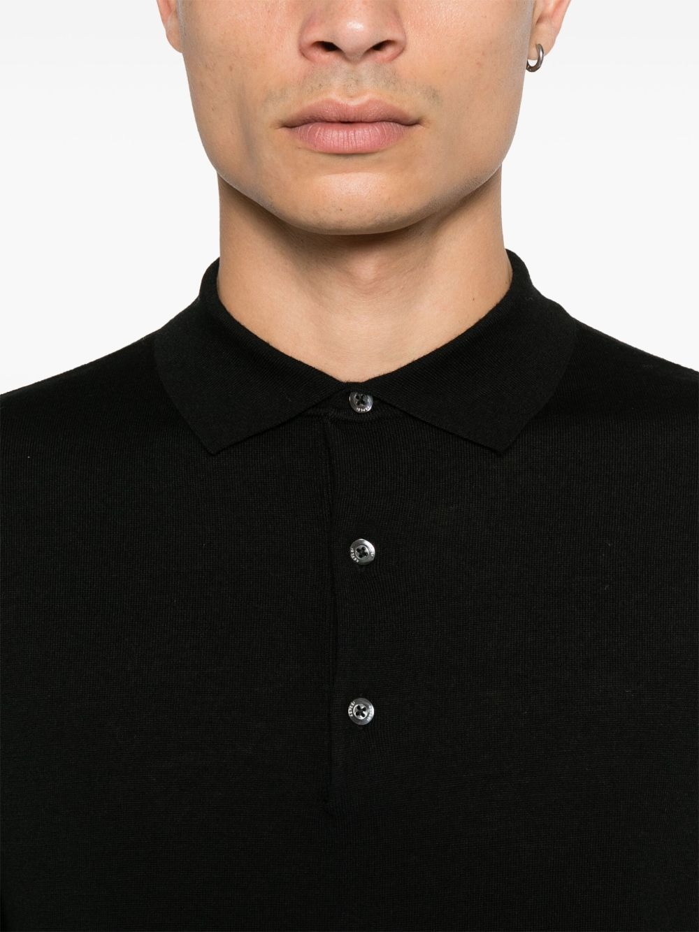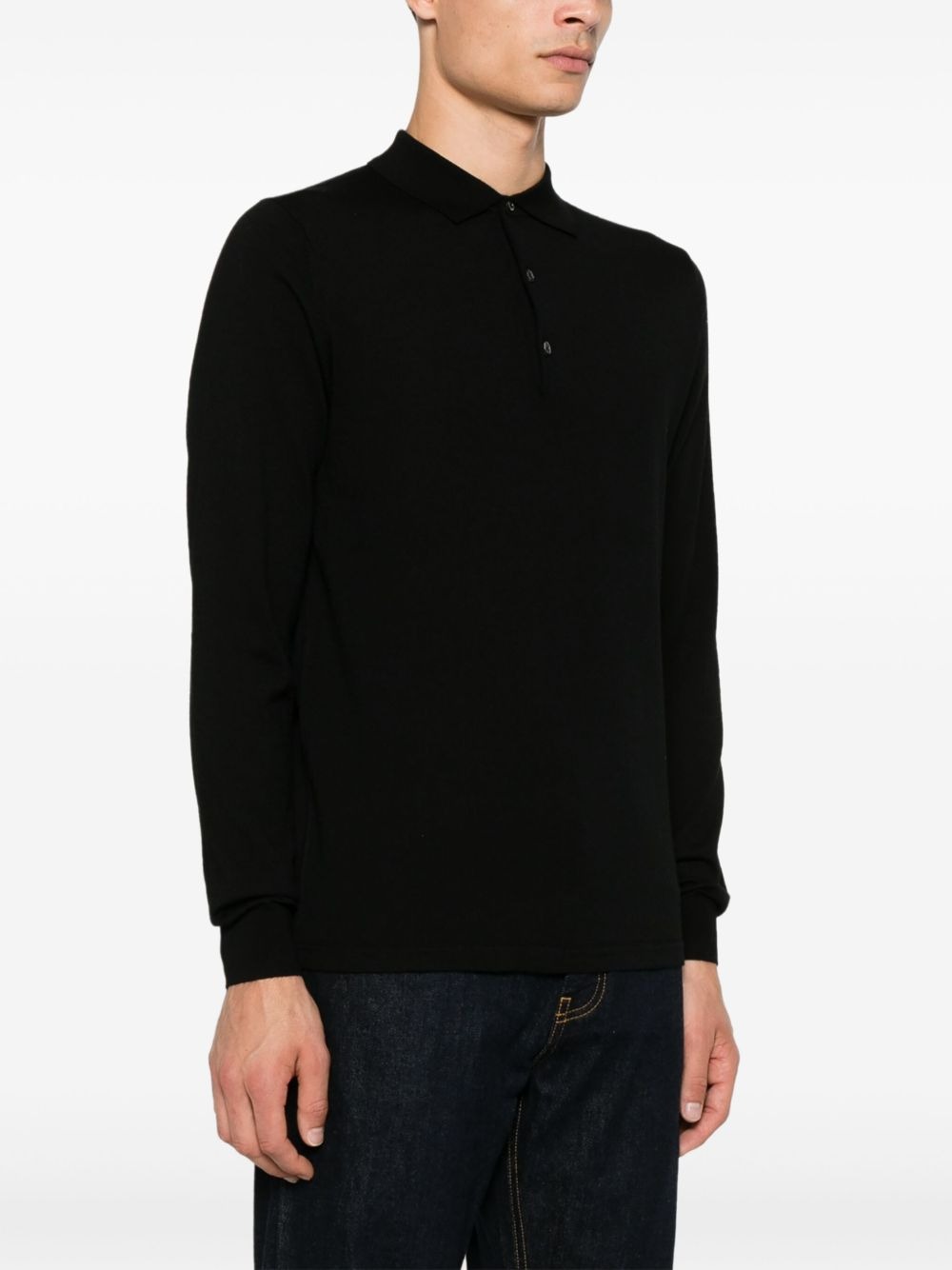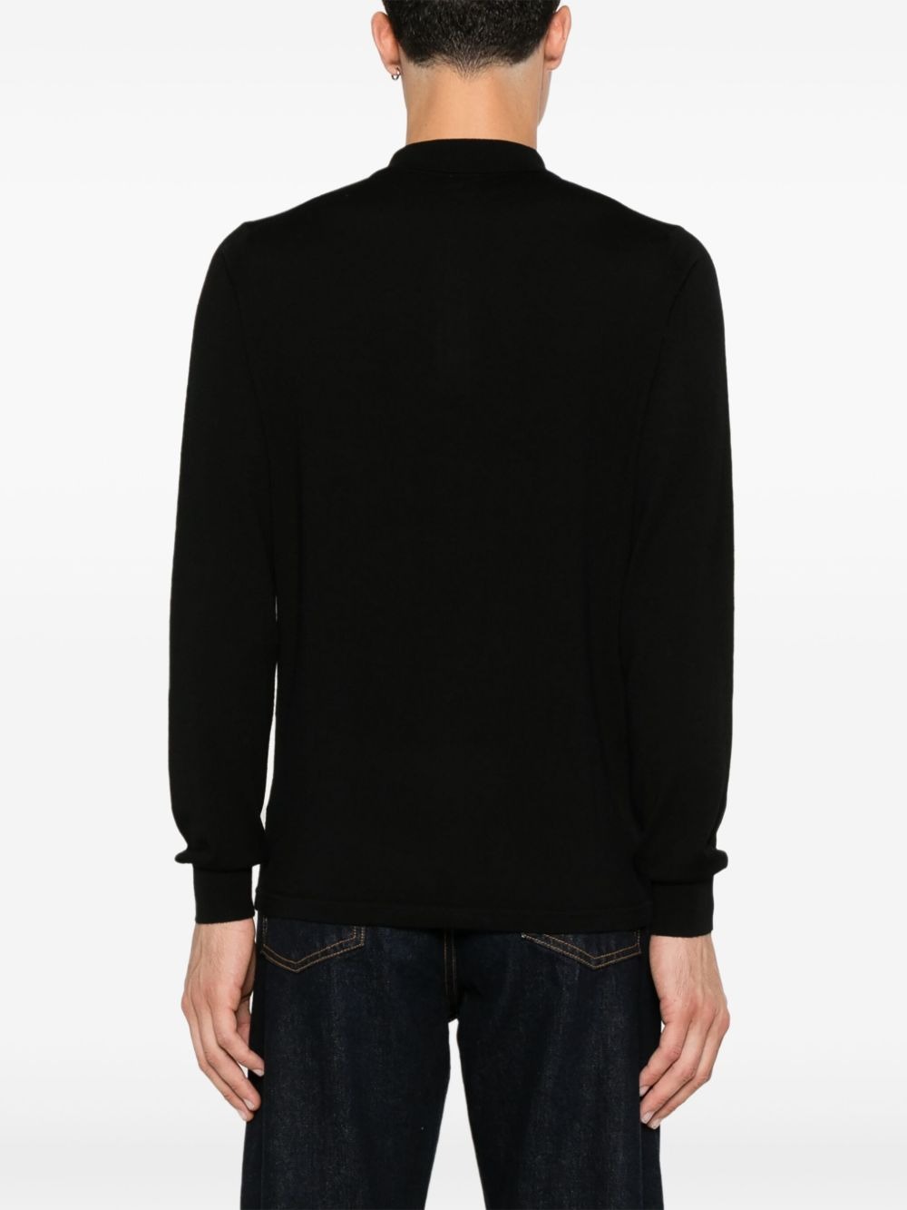 Aspesi black wool polo shirt with classic collar, long sleeves, ribbed hem, and ribbed cuffs.