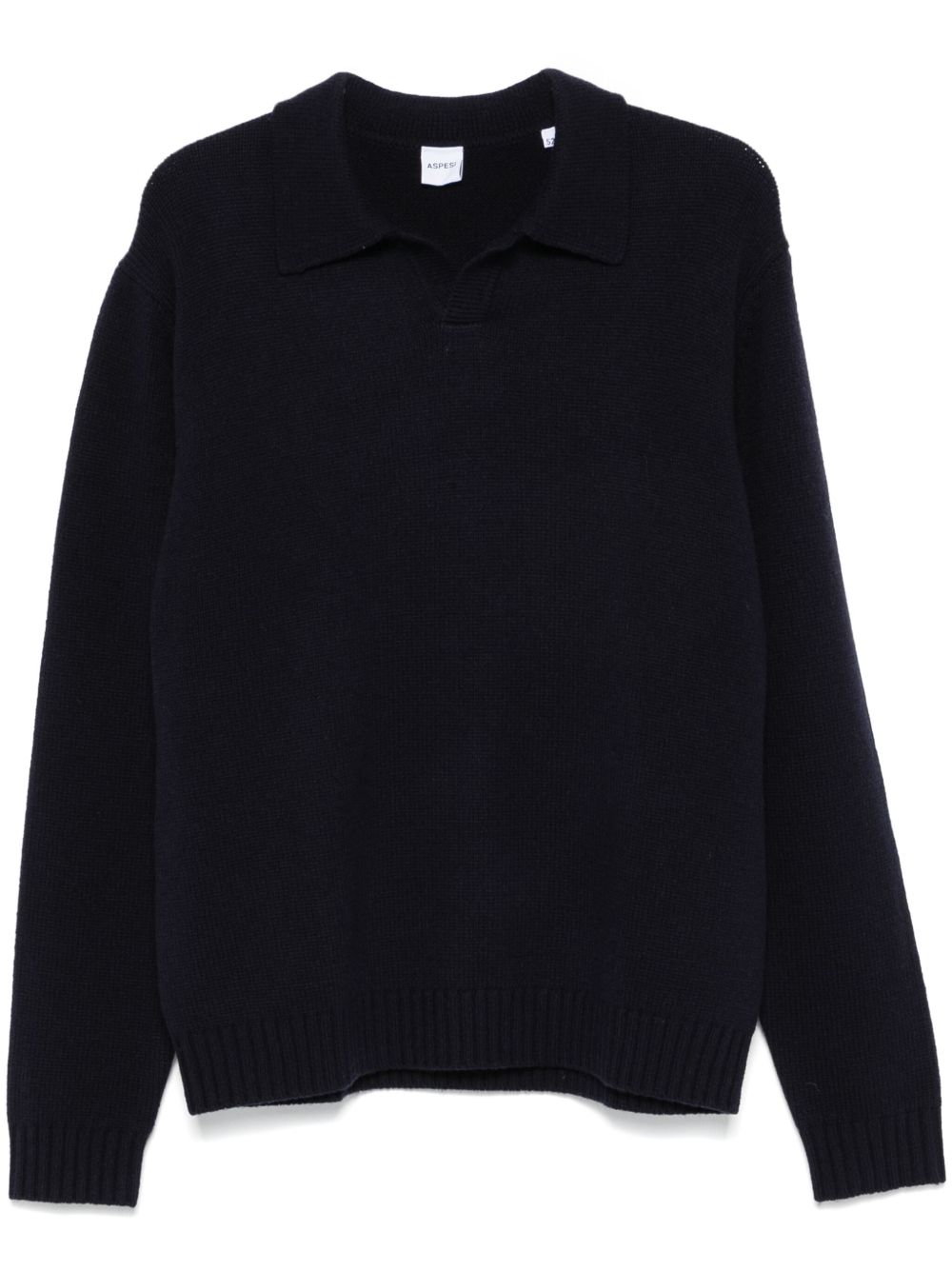 Aspesi navy polo shirt Mod.M162 in wool with classic collar, long sleeves, ribbed hem and cuffs.