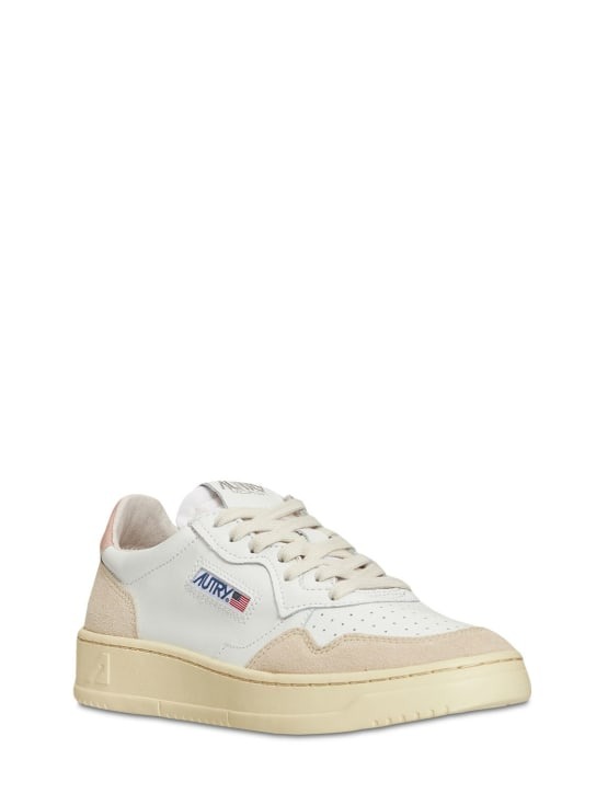 White and beige Medalist Low Aulw LS33 sneakers by Autry in leather with round toe, front lace-up closure, side logo, black heel detail and flat rubber sole.