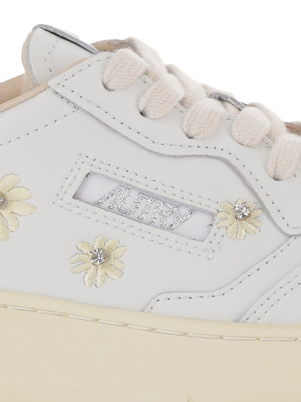 Medalist Low Aulw WE01 white sneakers by Autry in leather with round toe, perforated design, lace-up closure, logo label, and rubber sole.