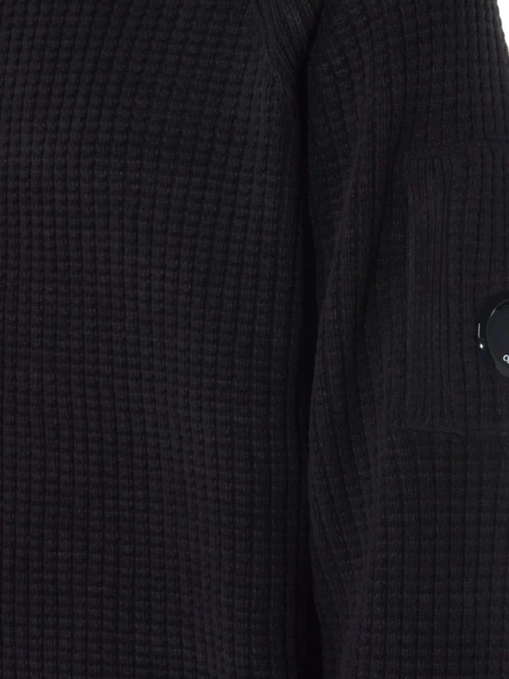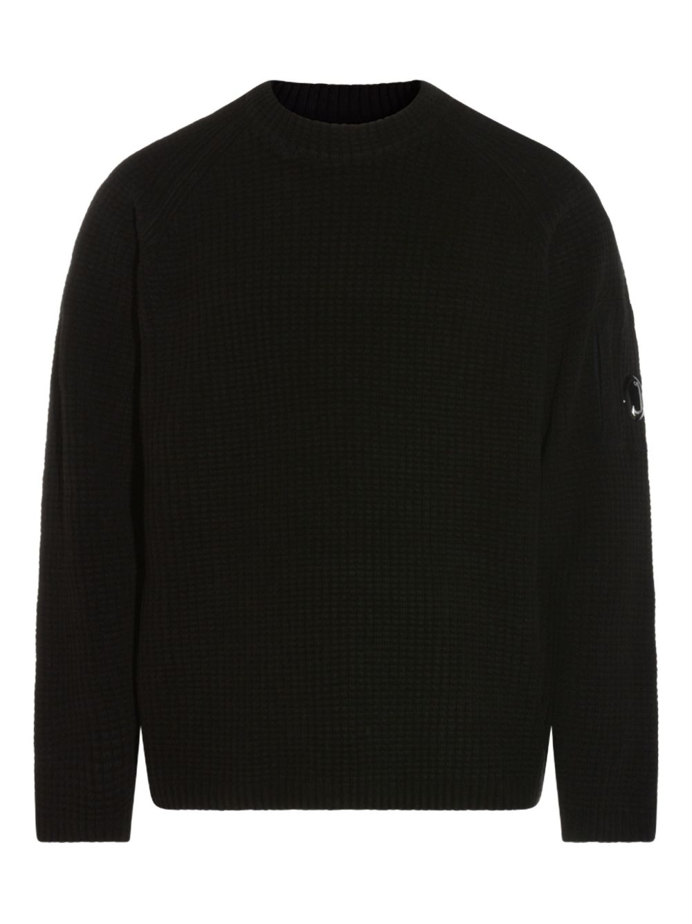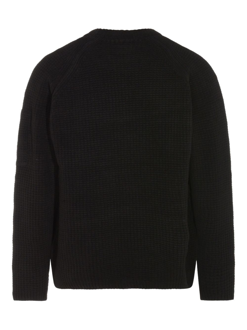 Black crew neck sweater by C.P. Company in ribbed cotton with C.P. lens on the arm and straight hem.