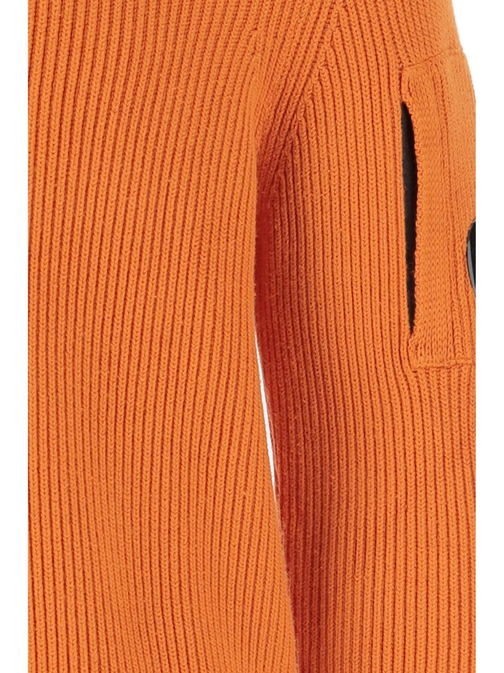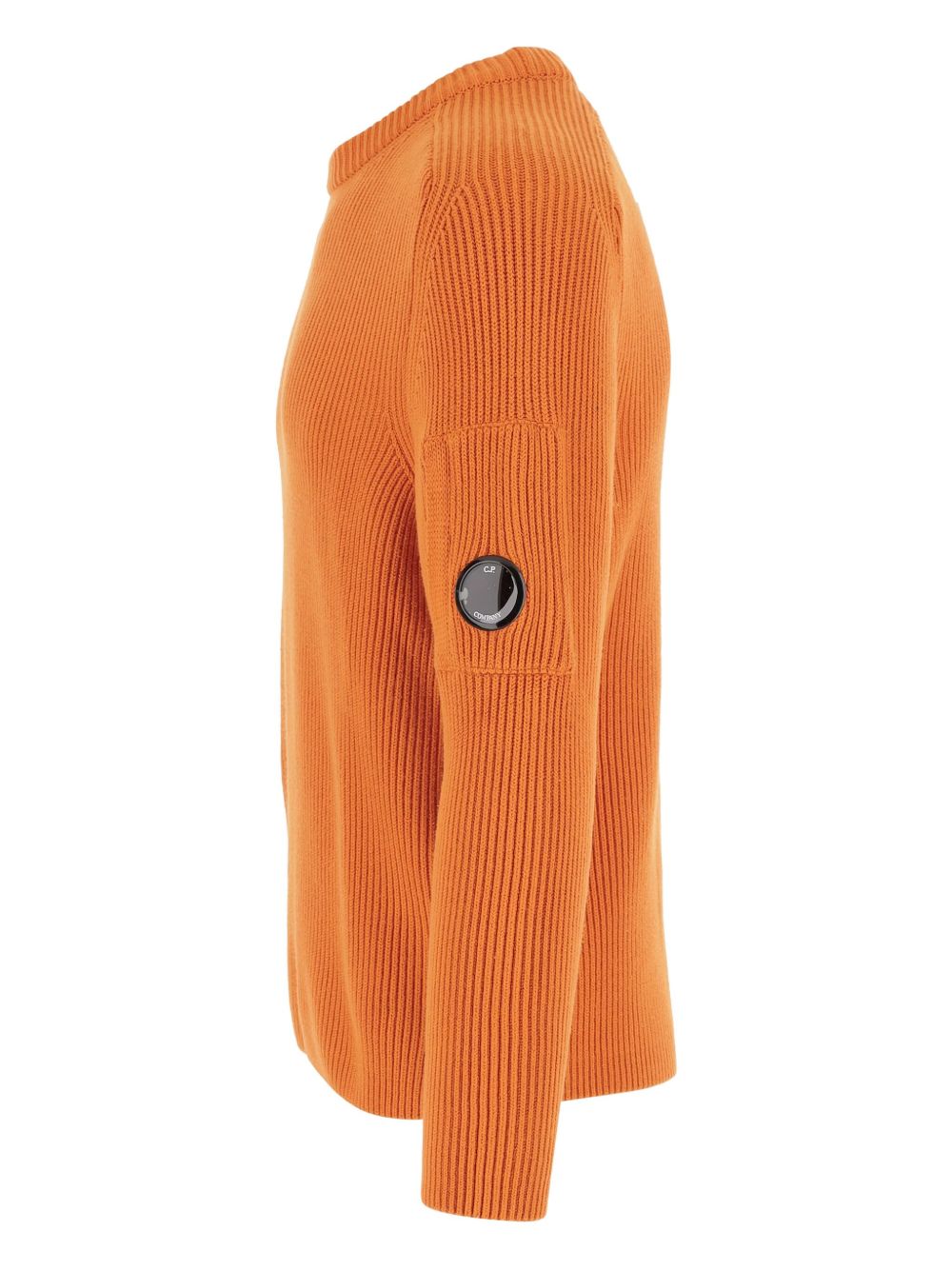 Orange crew neck sweater by C.P. Company in ribbed cotton with C.P. lens on the arm and straight hem.