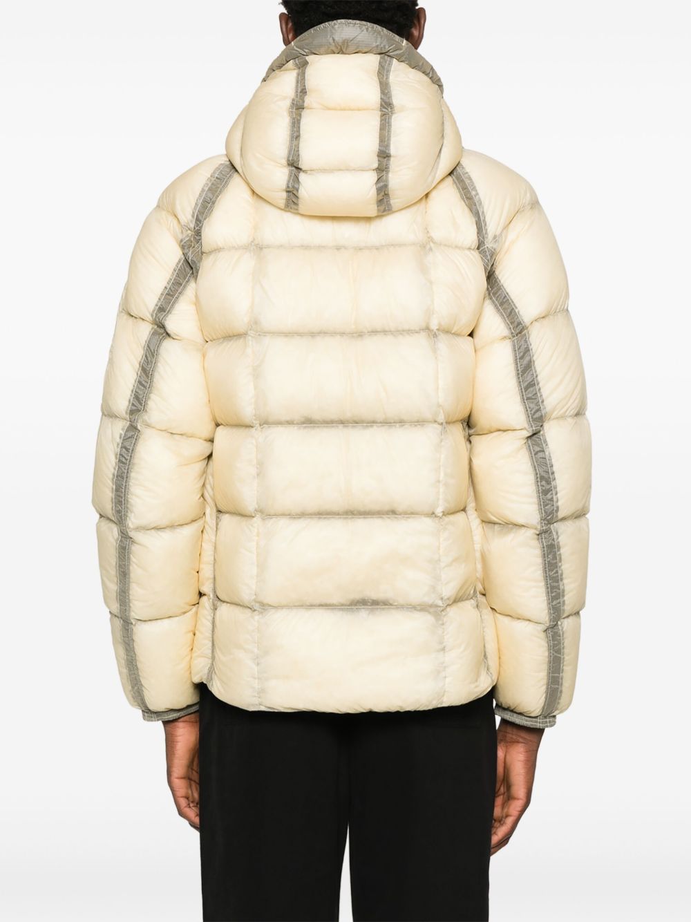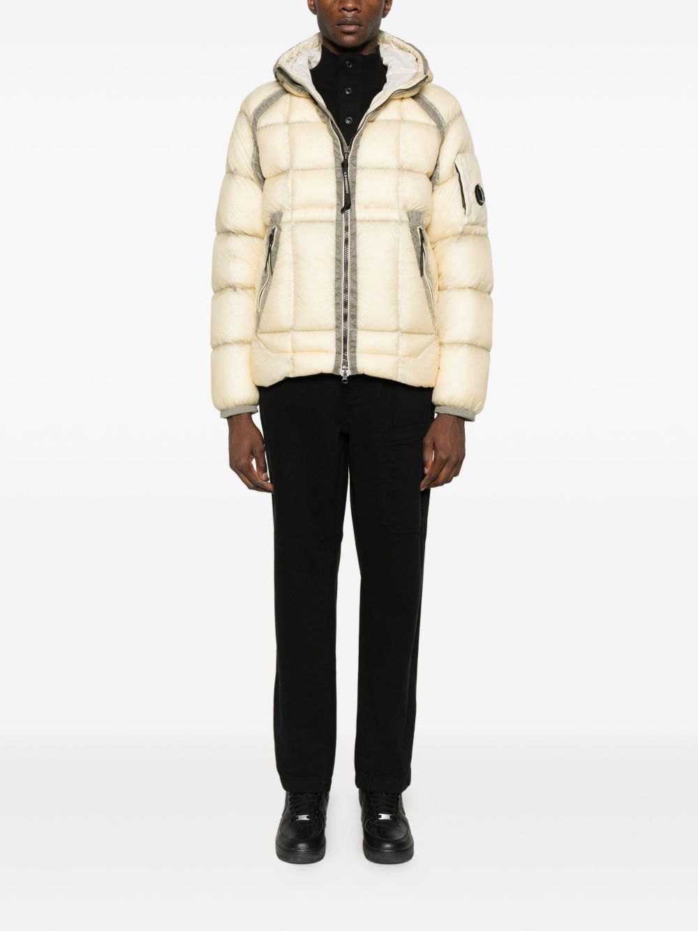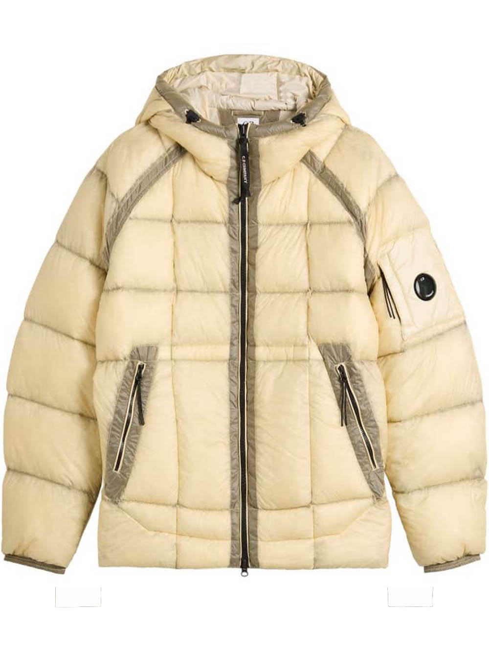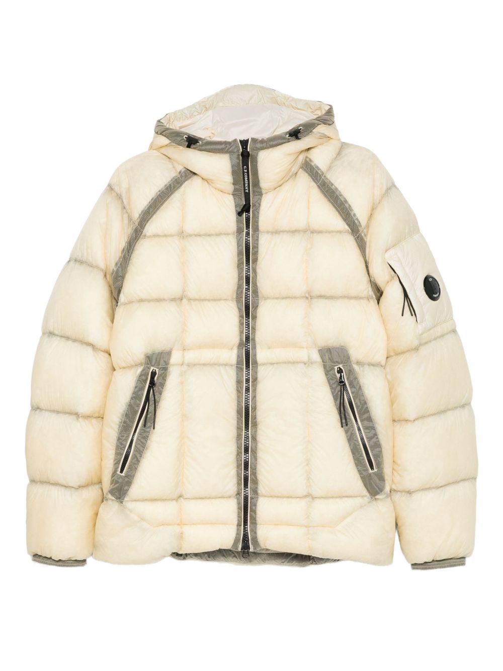 C.P. Company D.D. Shell Medium pistachio padded jacket in polyamide with adjustable hood, full double-slider zip closure, side pockets with zips, and C.P. Company lens.
