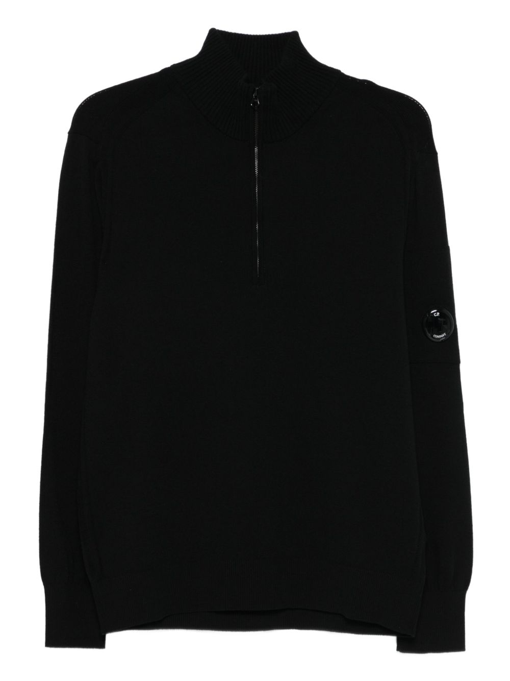 Black half-zip sweater by C.P. Company in wool with ribbed collar, C.P. Company lens, contrasting stitching, ribbed cuffs, and hem.