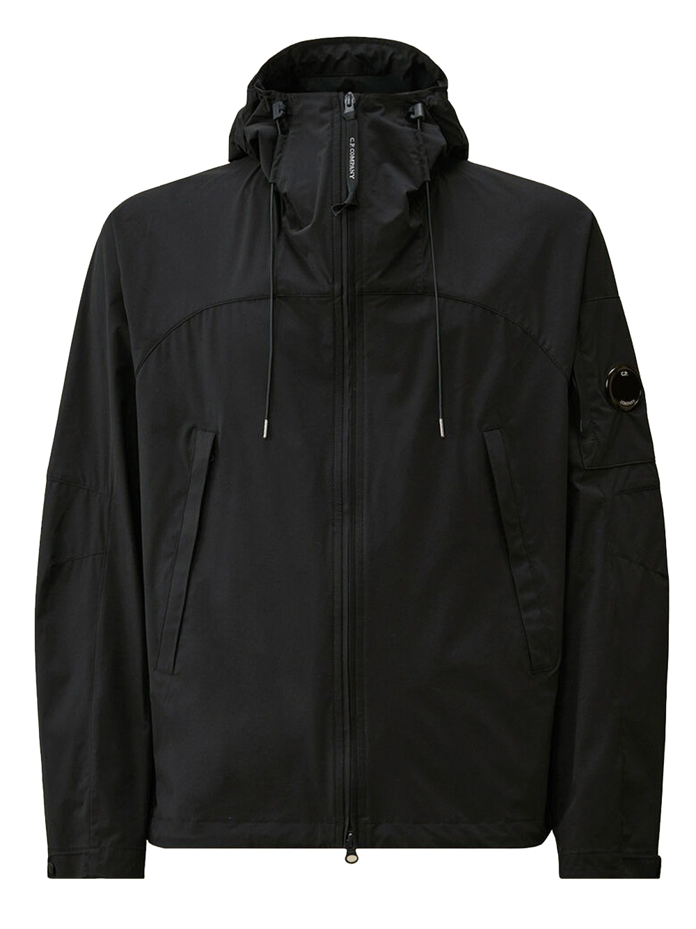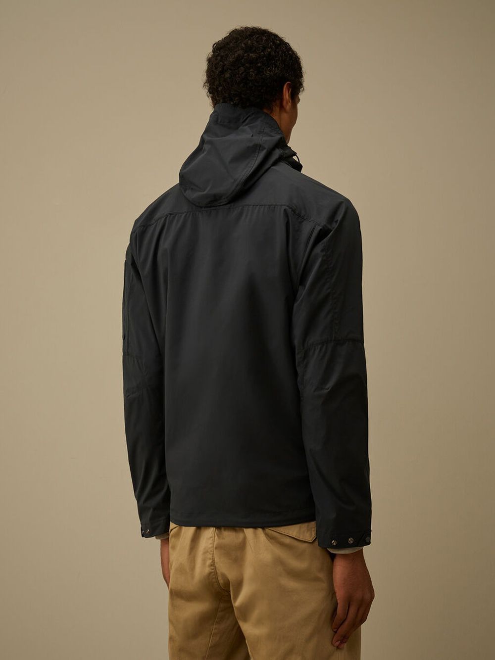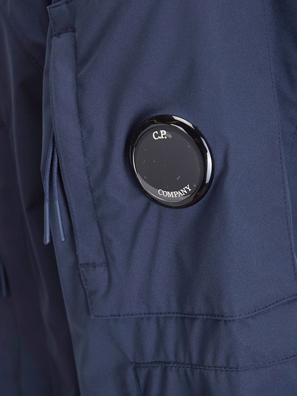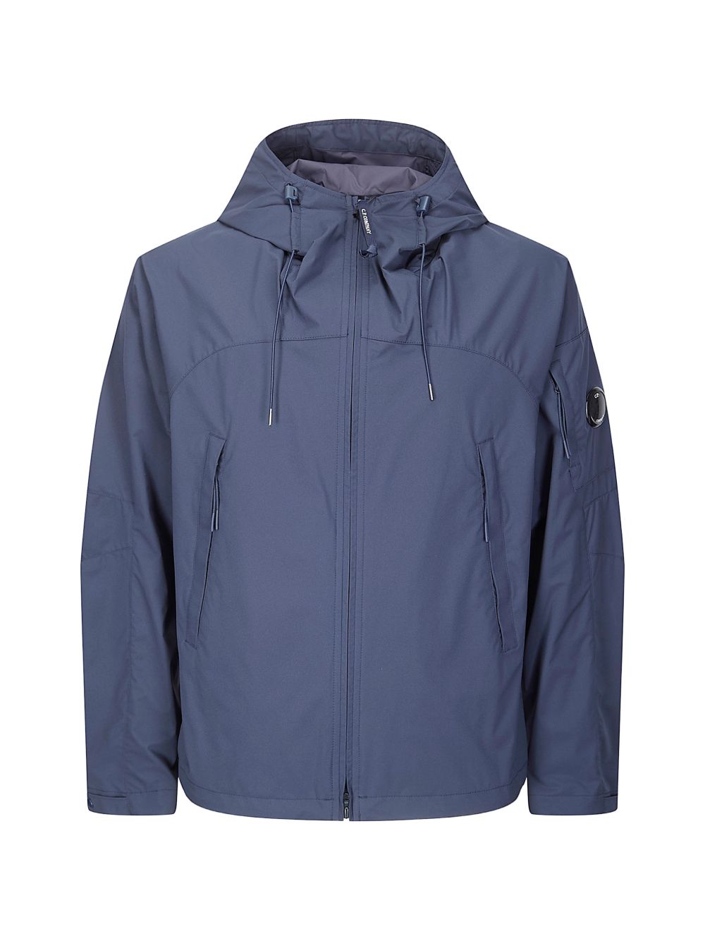 Navy jacket by C.P. Company in polyester with logo appliqué, zip closure, pockets, and drawstring hood.