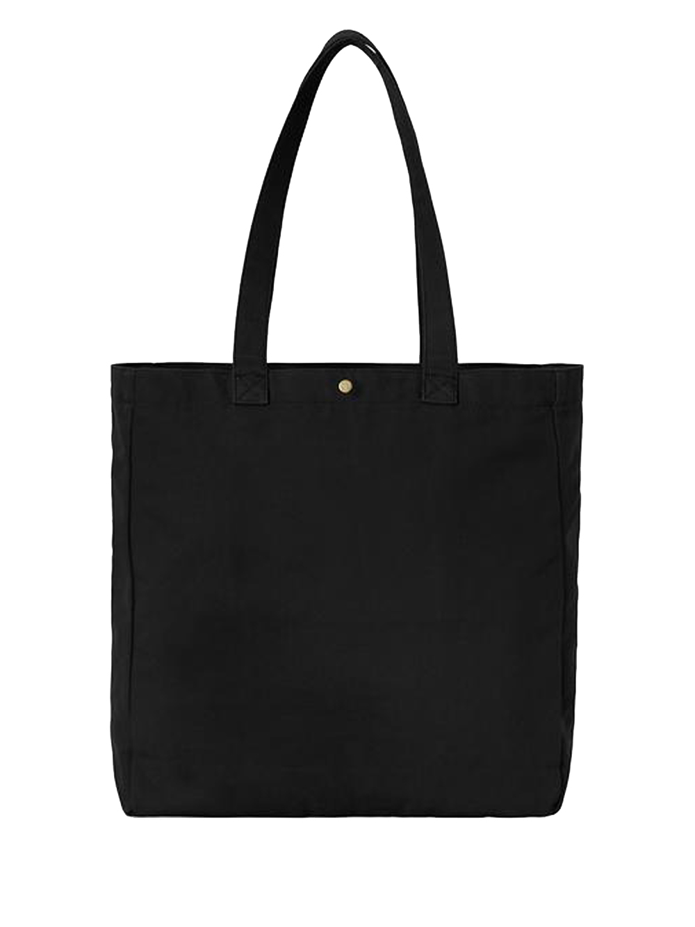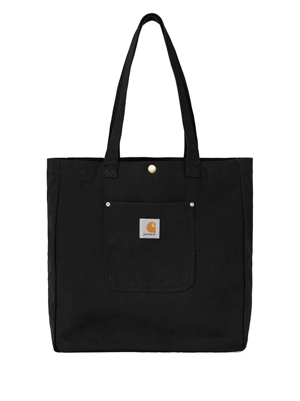 Carhartt Wip black Bay Tote bag in cotton with two handles, front pocket with label, and snap button closure.