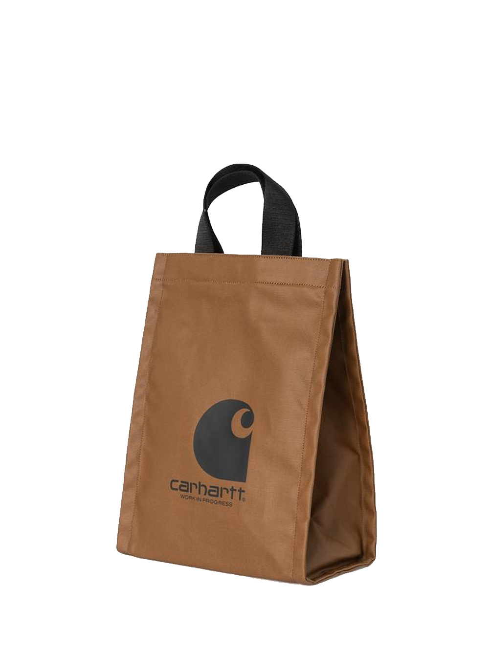 Carhartt cotton shopping bag with handle, logo print, and adjustable shoulder strap.
