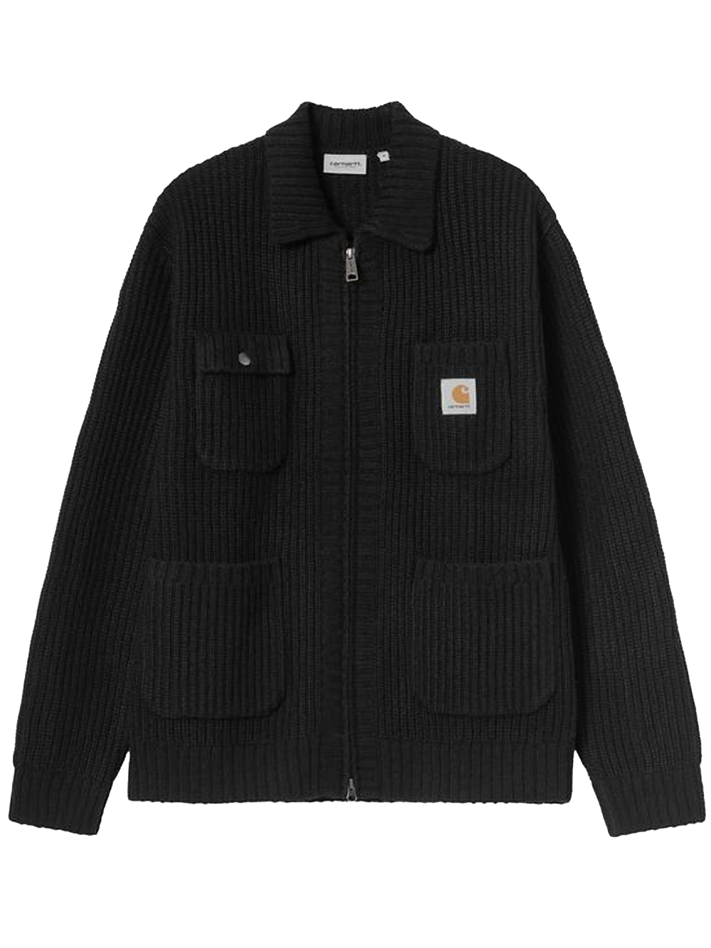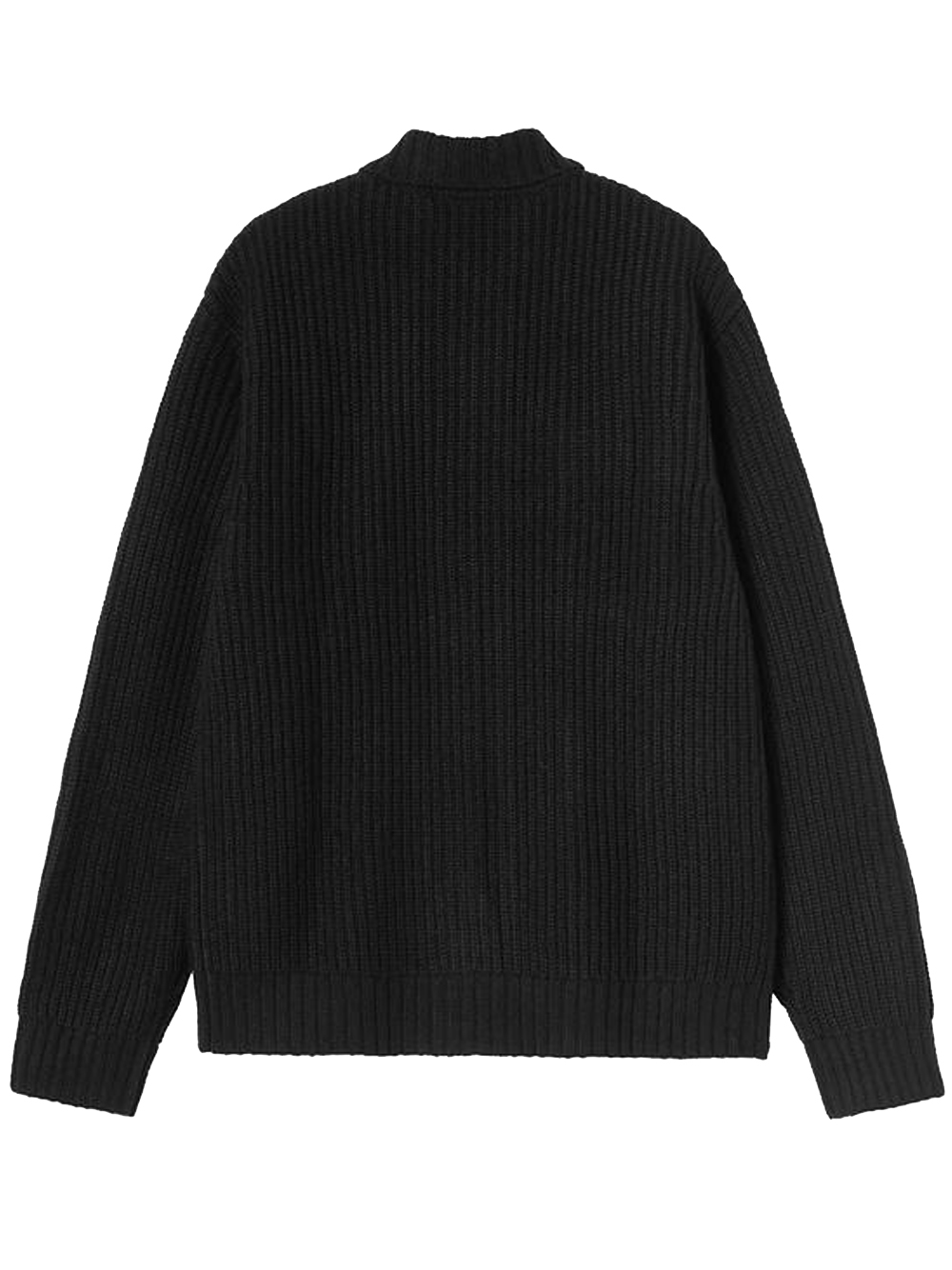 Black Core Knit jacket by Carhartt Wip in acrylic with ribbed knit, zip closure, patch pocket, welt pockets, and stand-up collar.