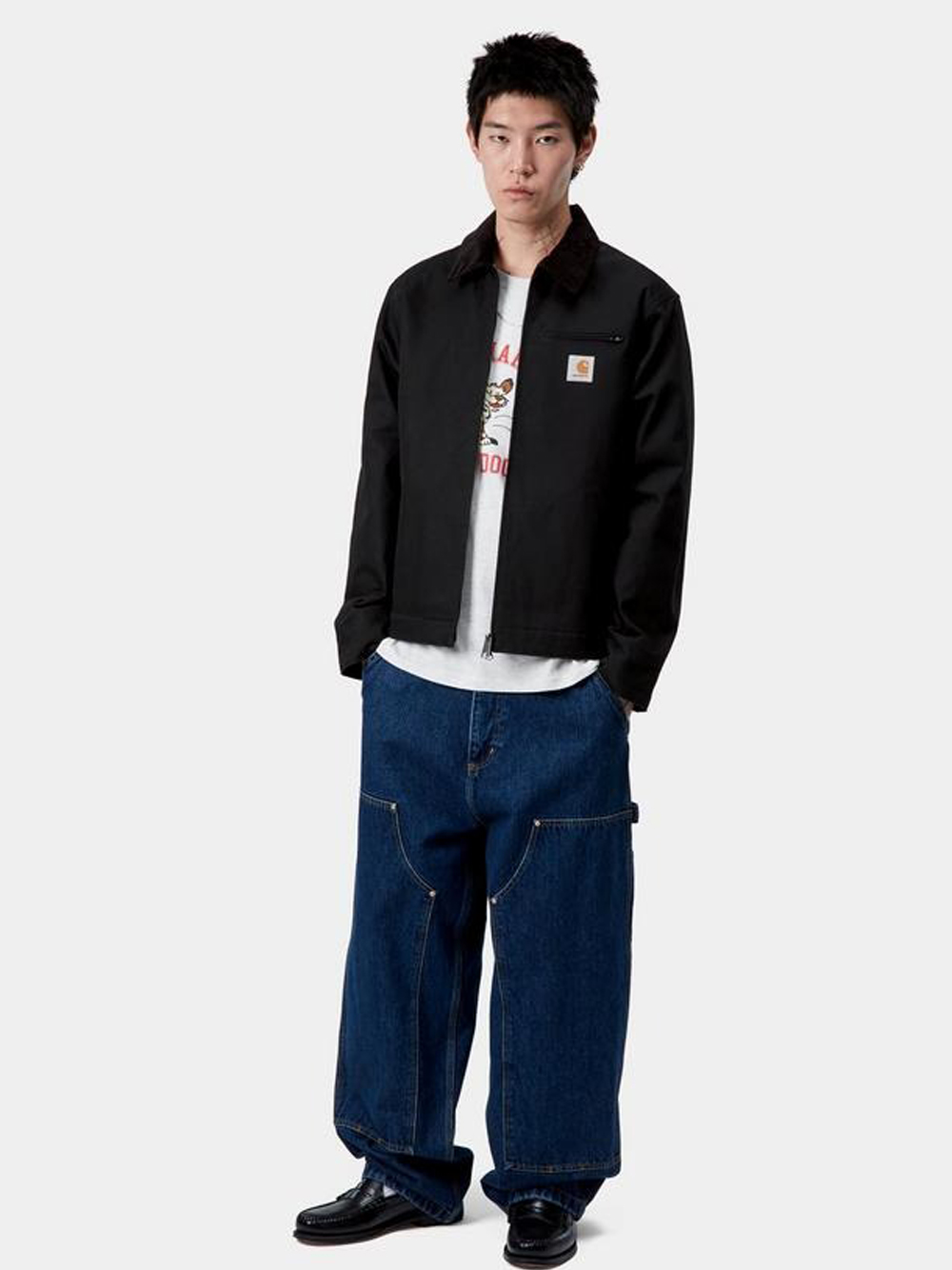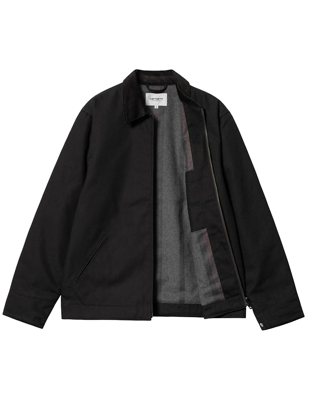 Carhartt Wip Detroit black jacket in cotton with classic Cordura collar, front zip closure, side zip pockets, chest zip pocket, and logo appliqué.