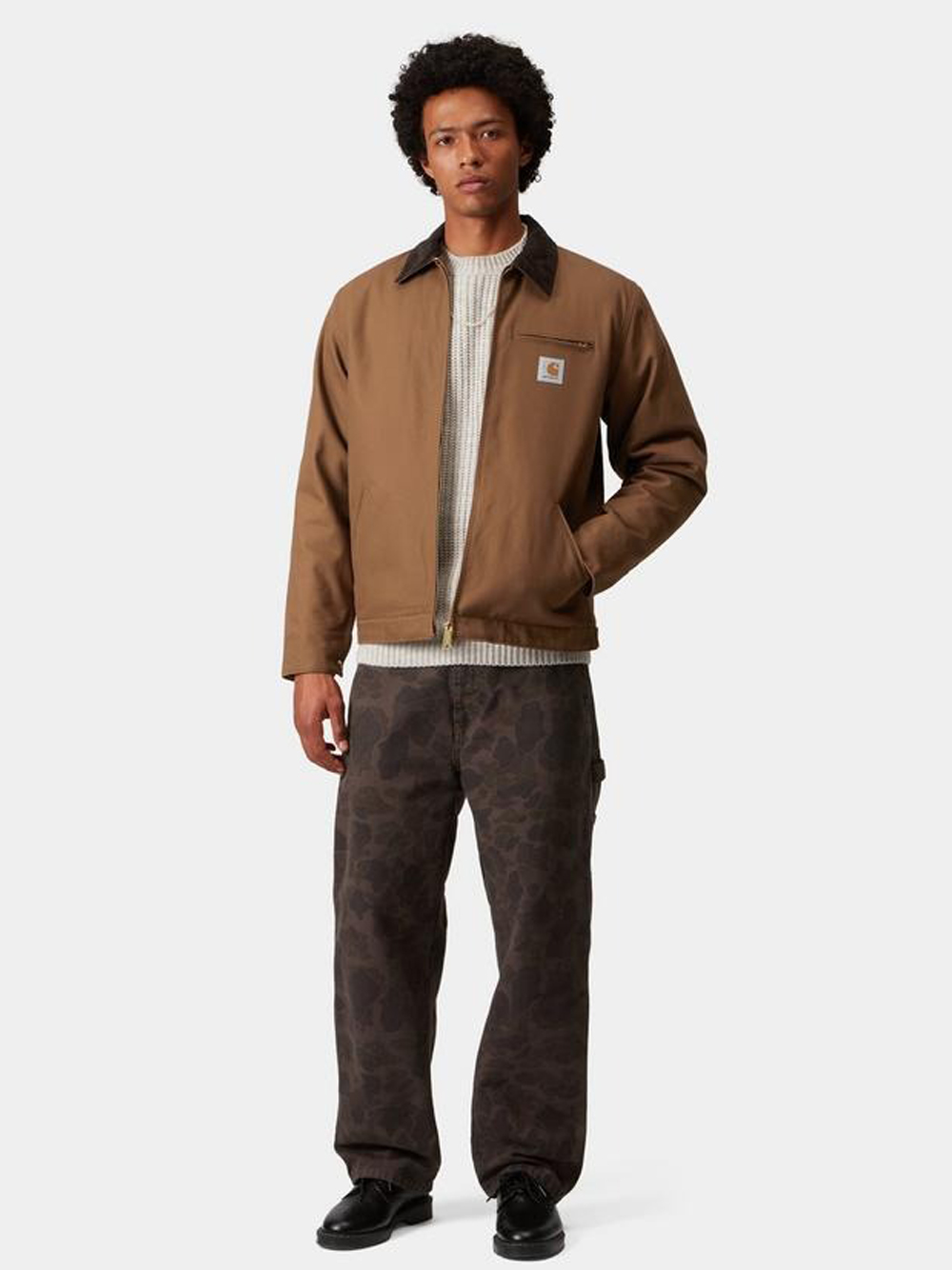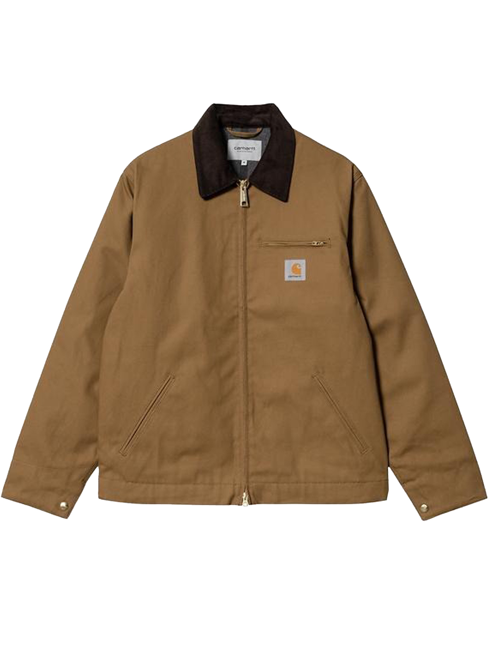 Carhartt Wip Detroit hamilton brown jacket in cotton with classic Cordura collar, front zip closure, side zip pockets, chest zip pocket, and logo appliqué.