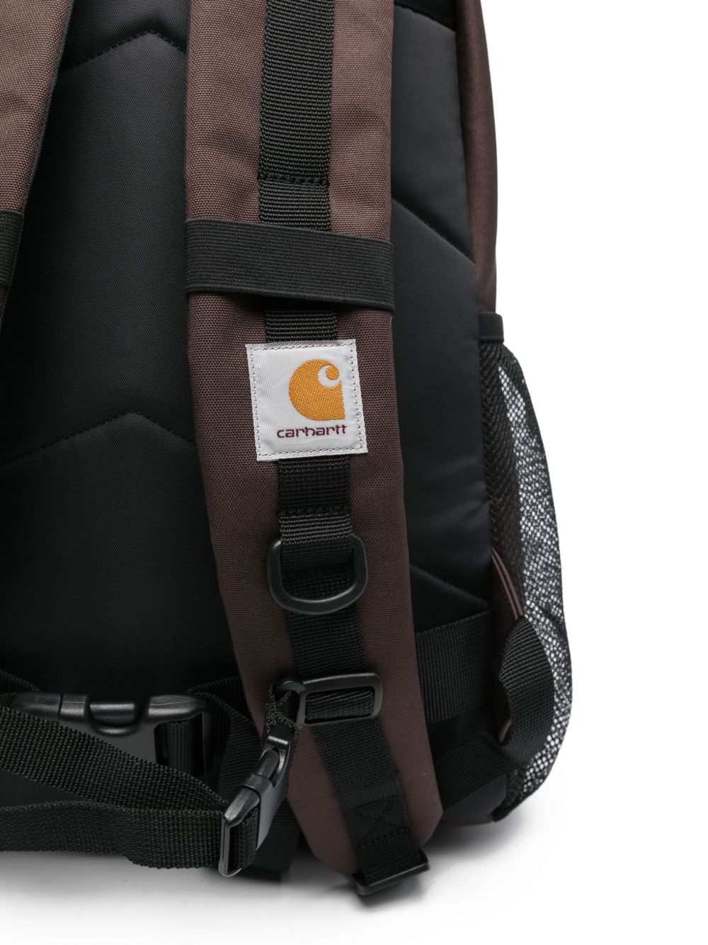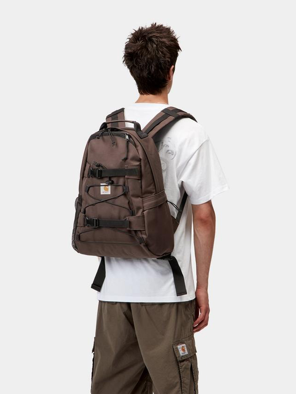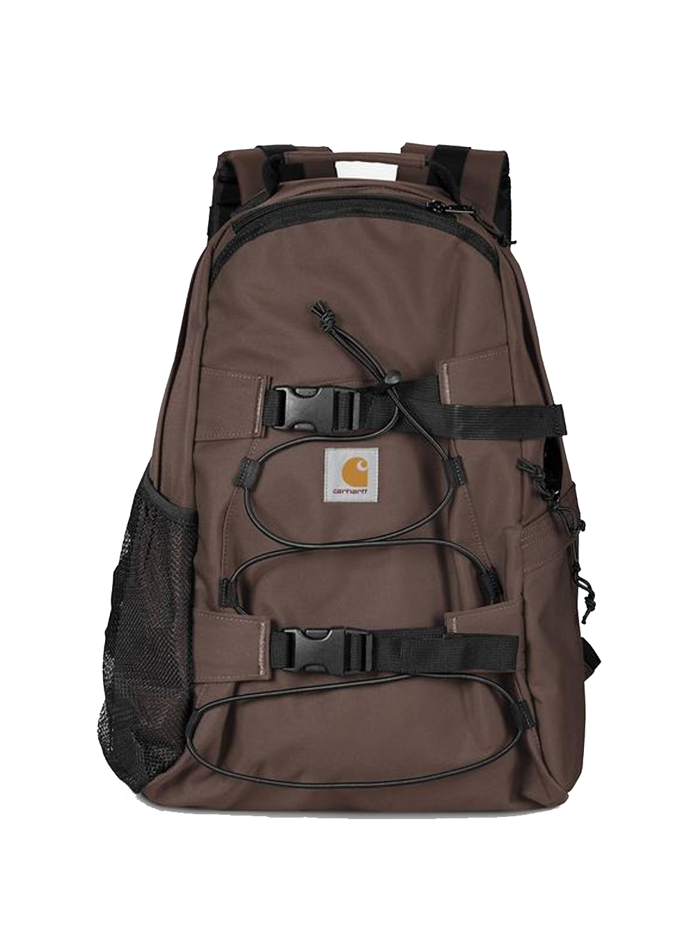 Palisander polyester Kickflip backpack by Carhartt wip with double-slider zipper closure, zippered side pocket, water-repellent finish, skateboard clicker attachment, logo applique on front and top handle.
