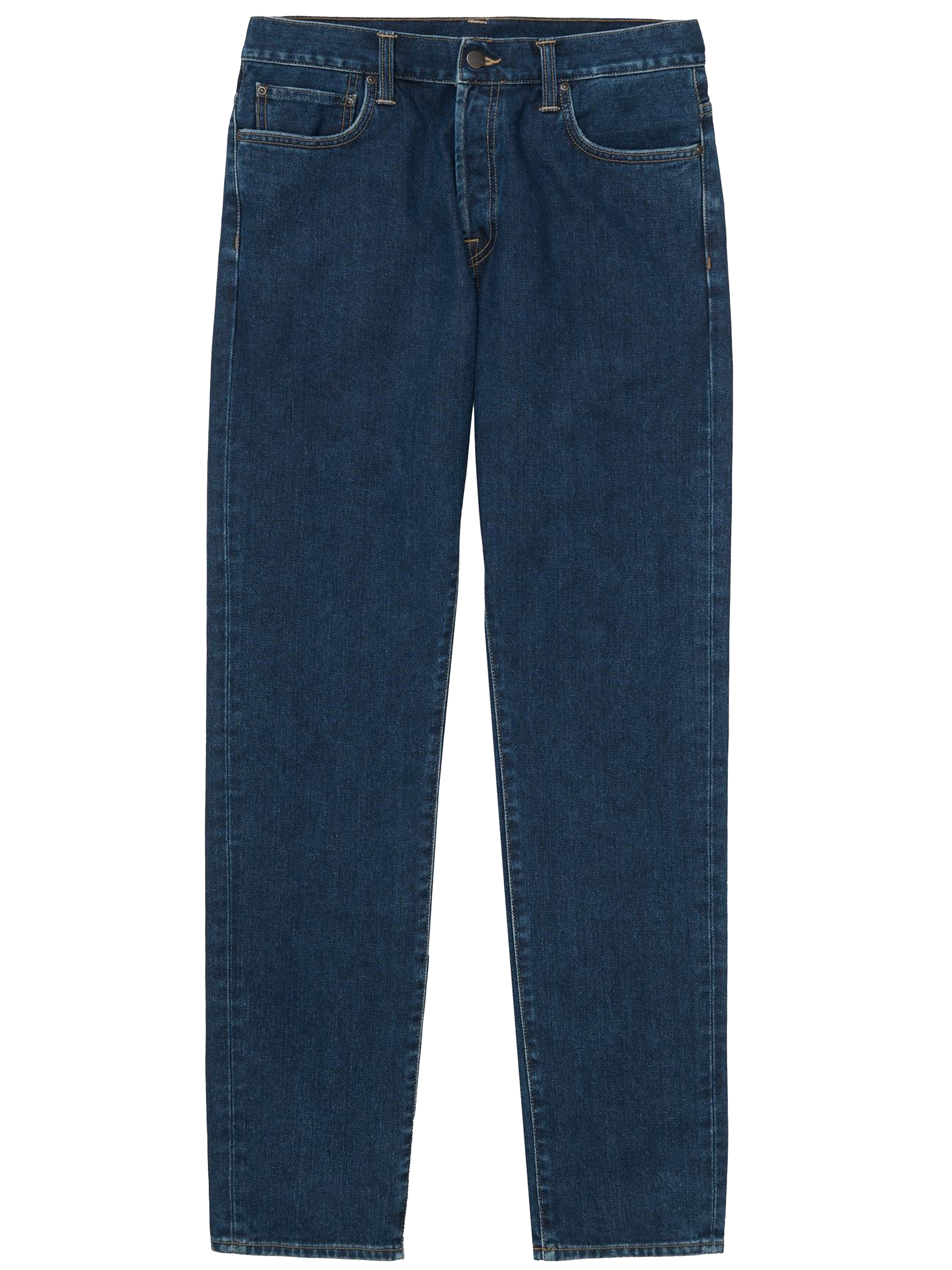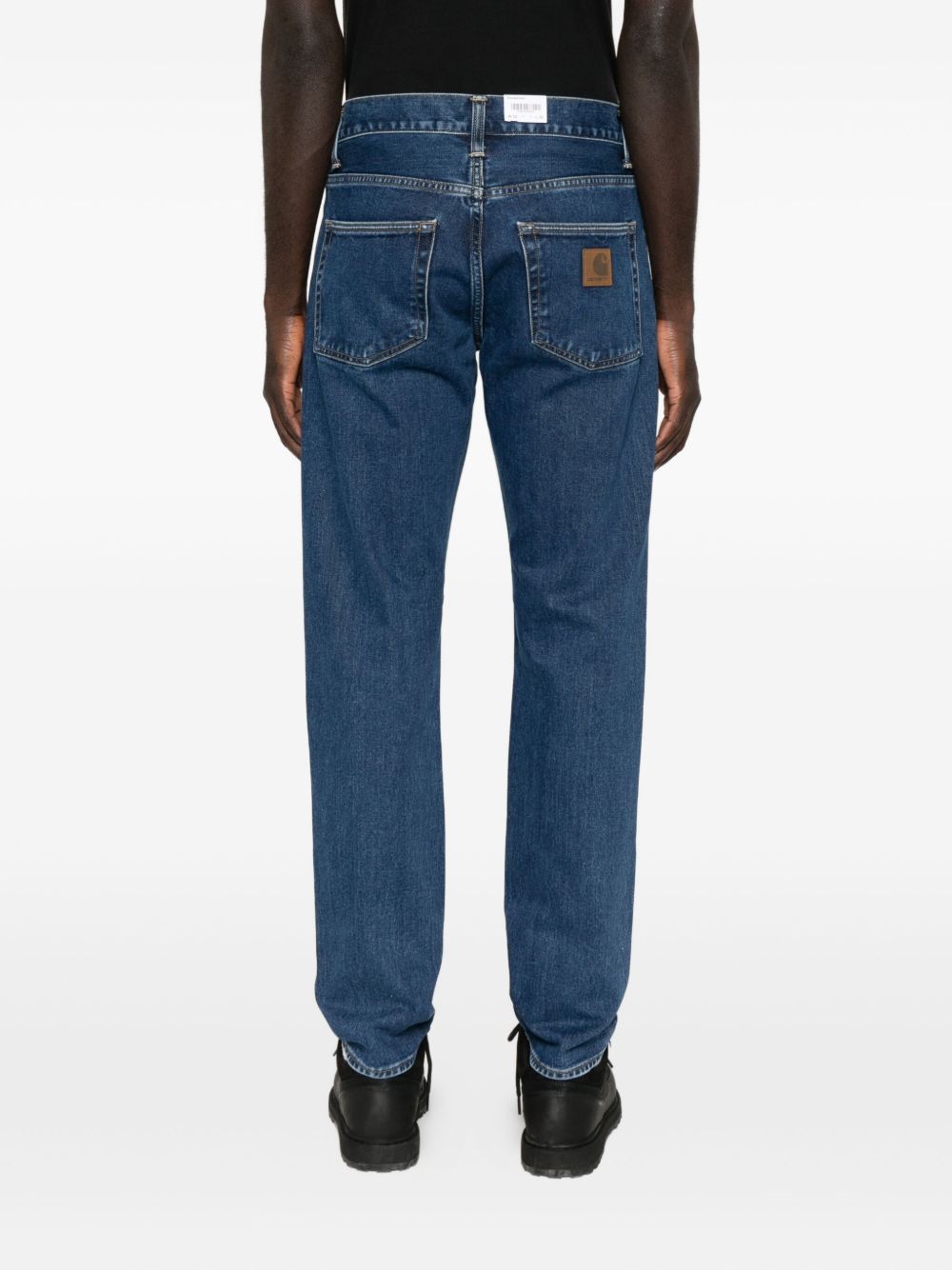 Klondike blue jeans by Carhartt Wip in cotton with low rise, regular fit, back yoke, metal rivets, logo application on the back and faded wash.