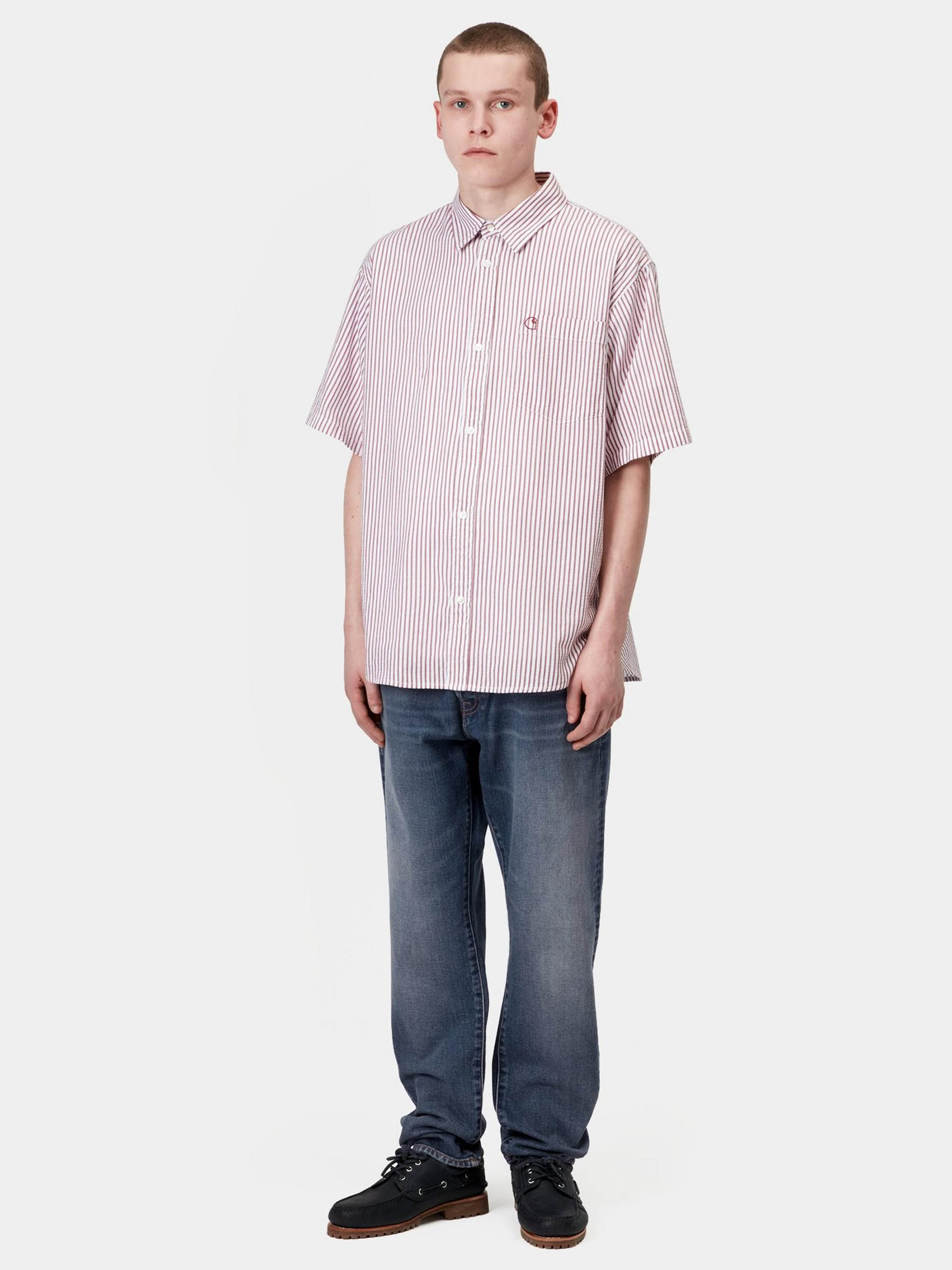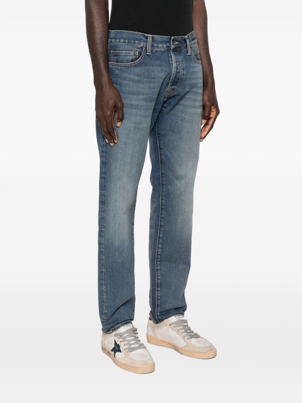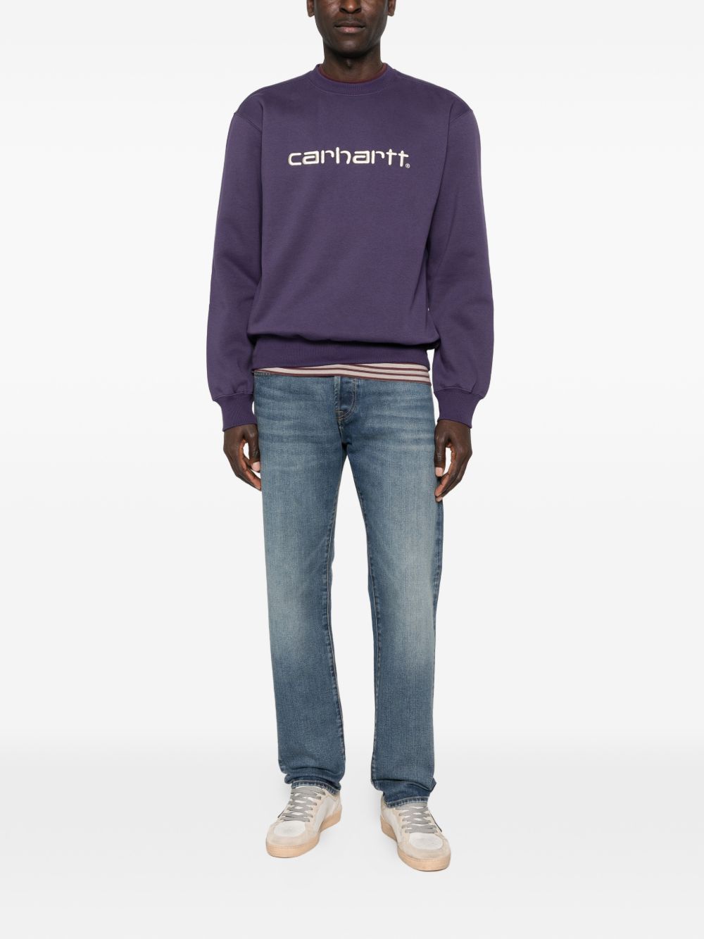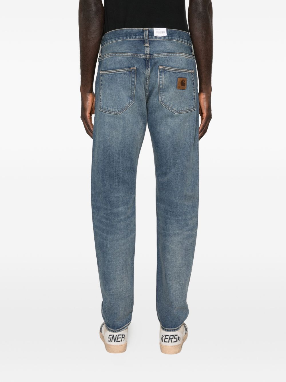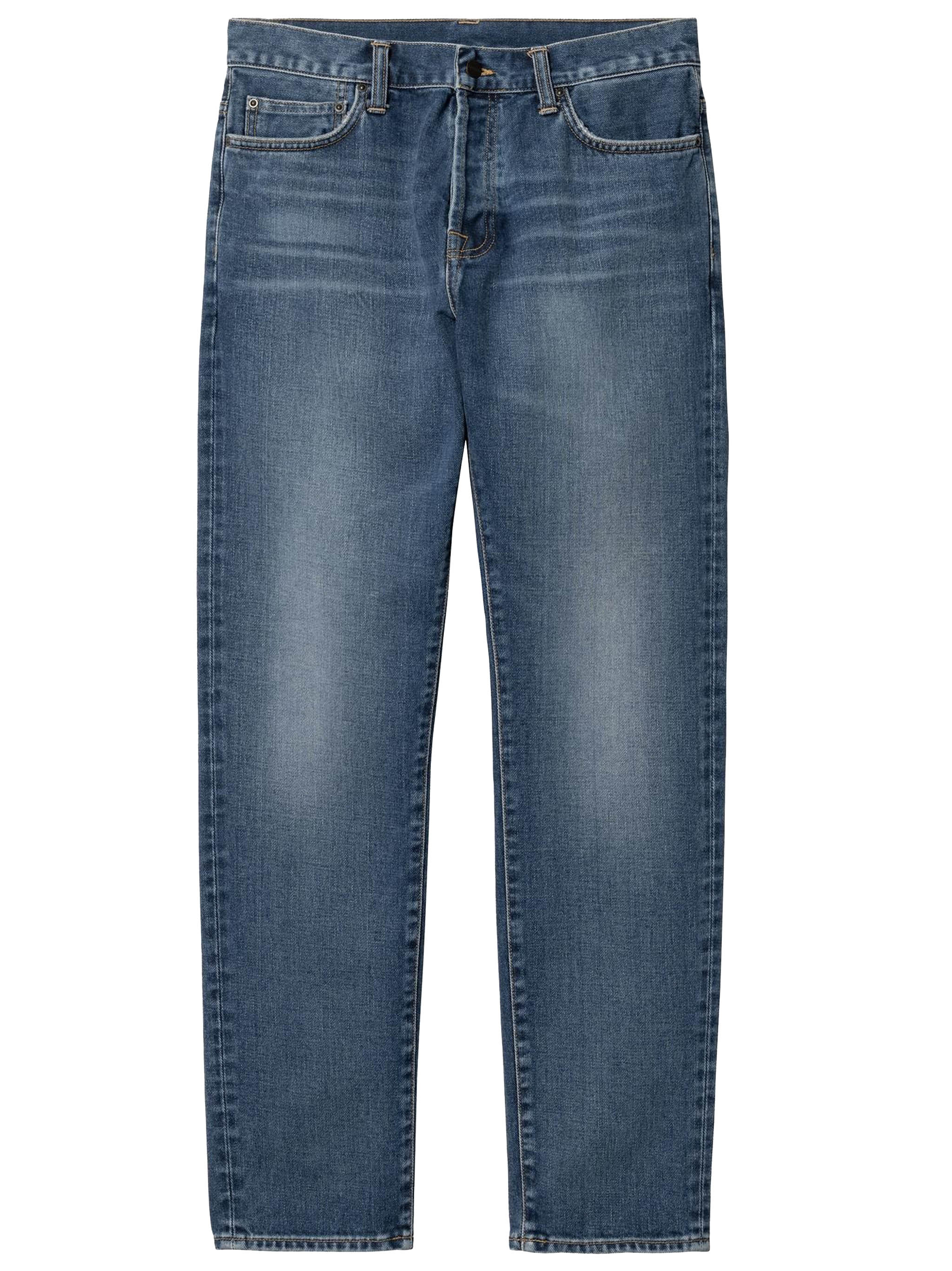 Klondike blue jeans by Carhartt Wip in cotton with low rise, regular fit, back yoke, metal rivets, logo application on the back and faded wash.