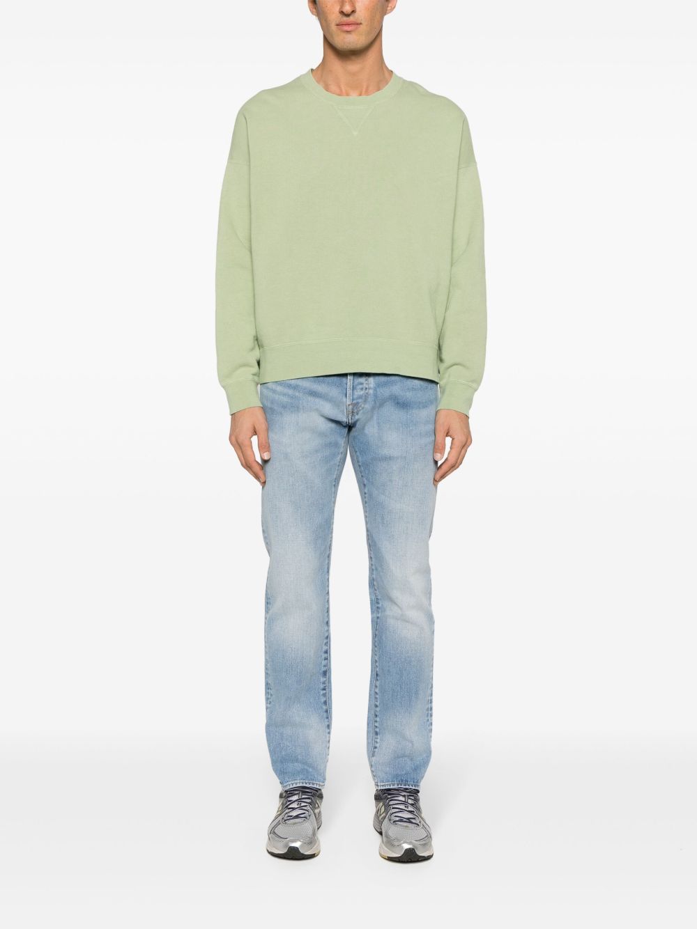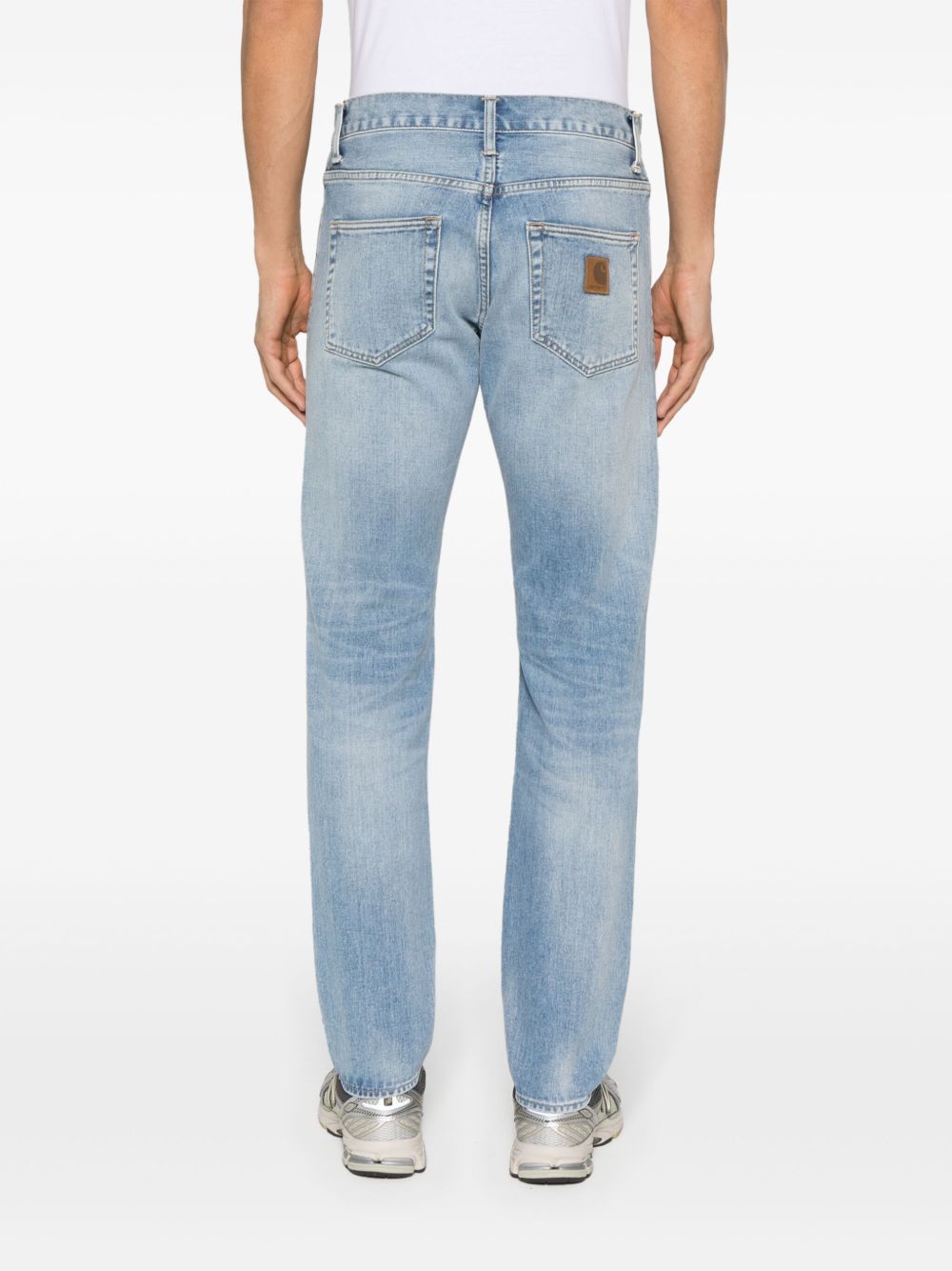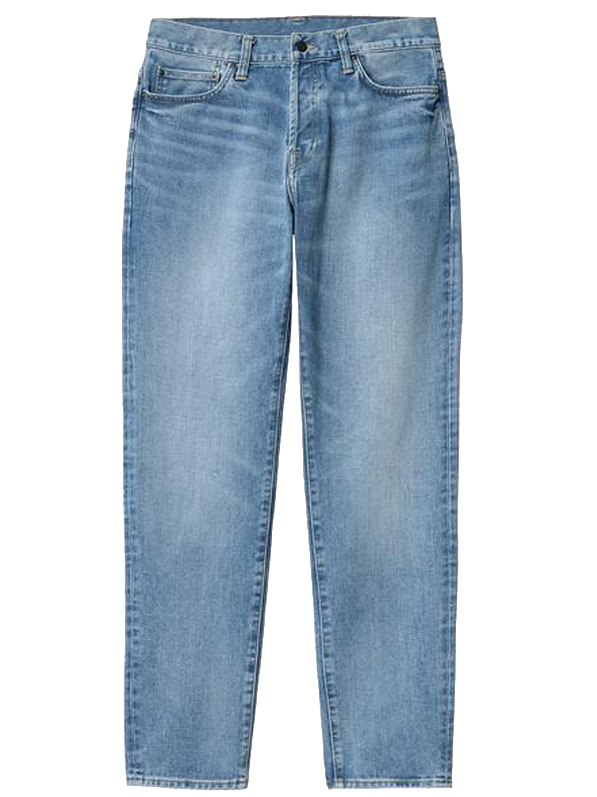 Klondike blue jeans by Carhartt Wip in cotton with low rise, regular fit, back yoke, metal rivets, logo application on the back and faded wash.