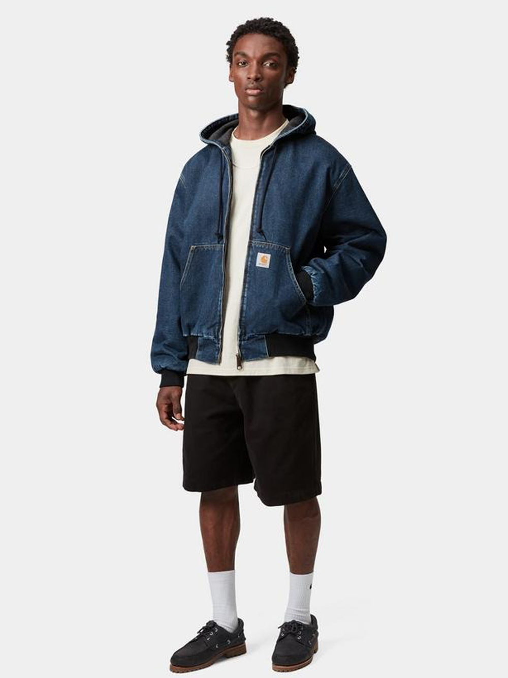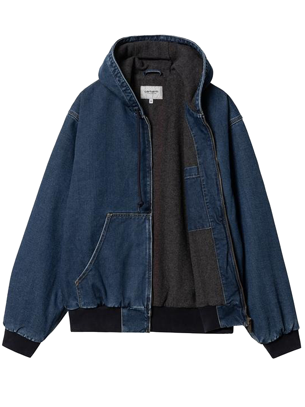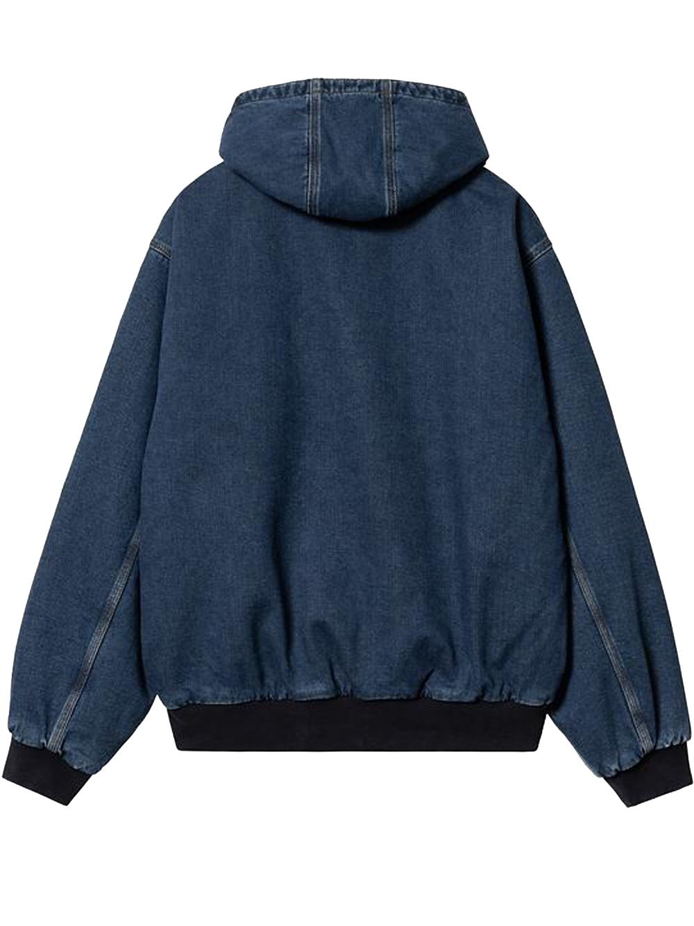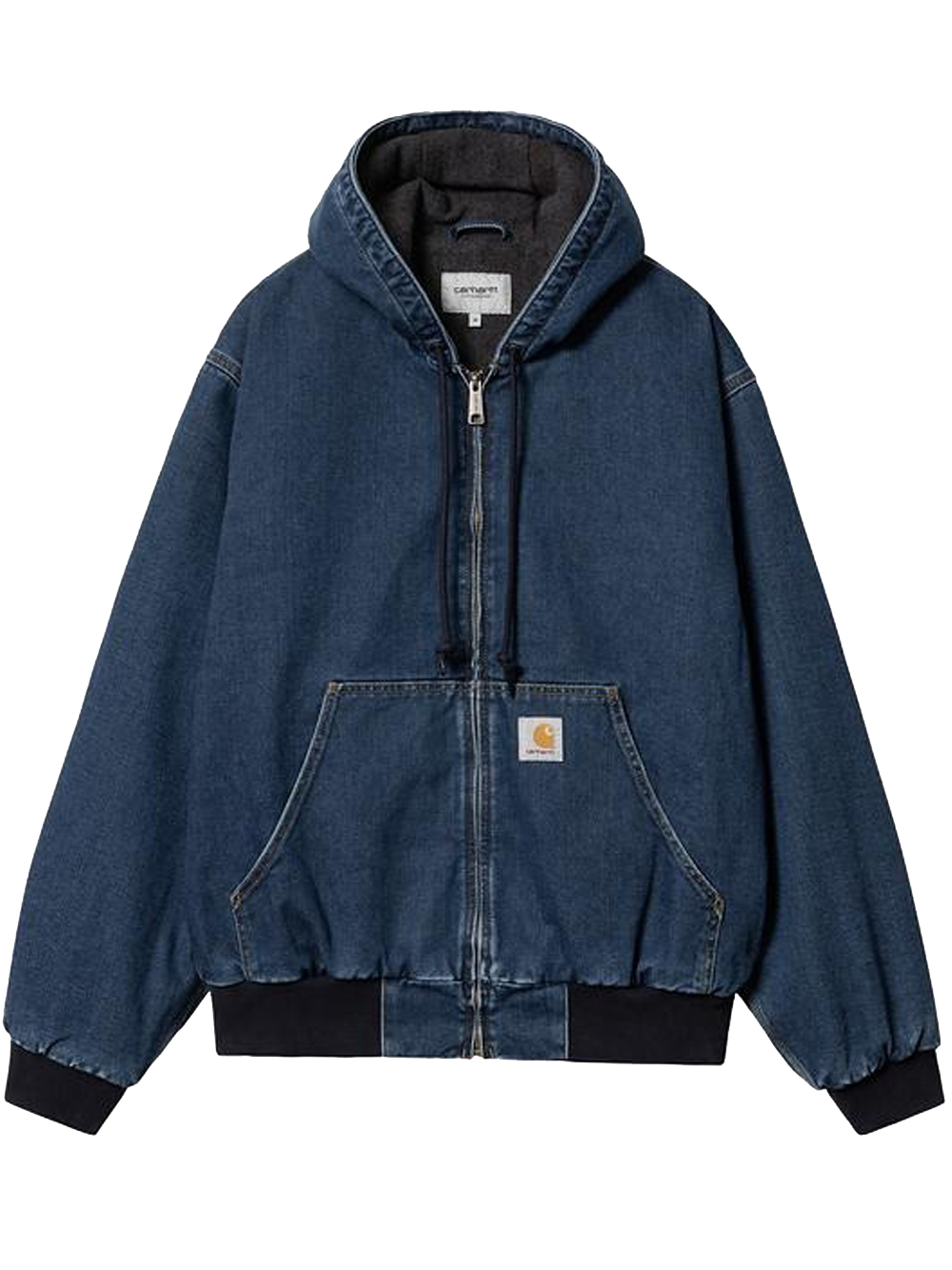 Carhartt Wip OG Active Jacket in blue cotton with quilted hood closure, zip closure, kangaroo pockets, elastic hem, and elastic cuffs.