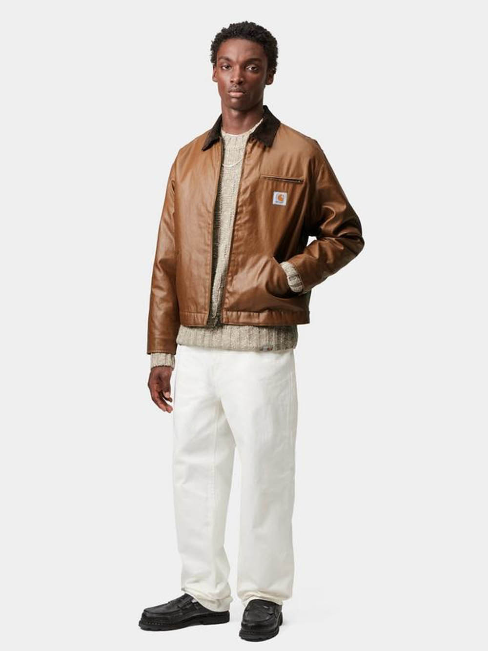 Brown OG Dean jacket by Carhartt Wip in cotton with classic Cordura collar, front zip closure, side zip pockets, chest zip pocket, and logo appliqué.