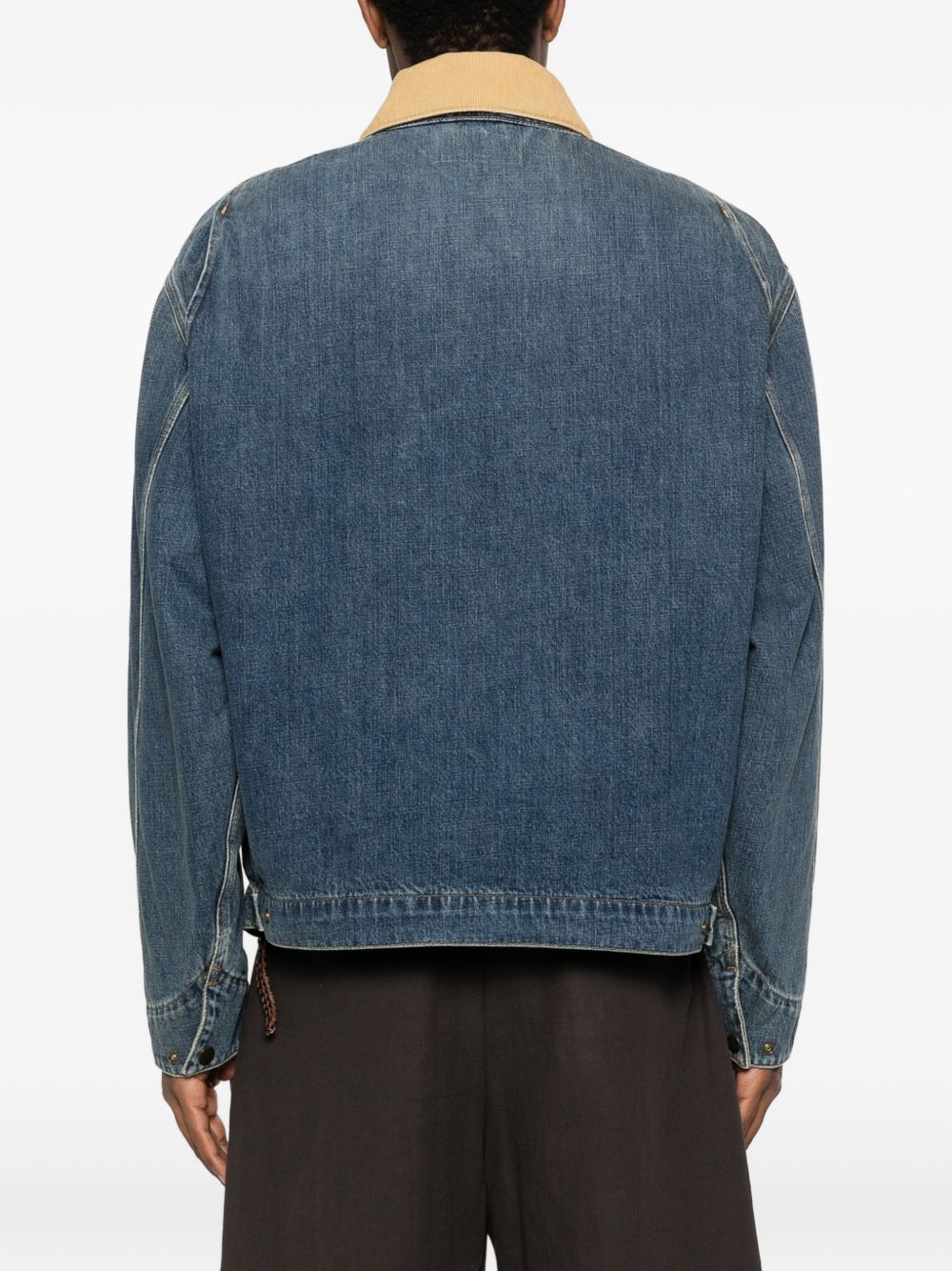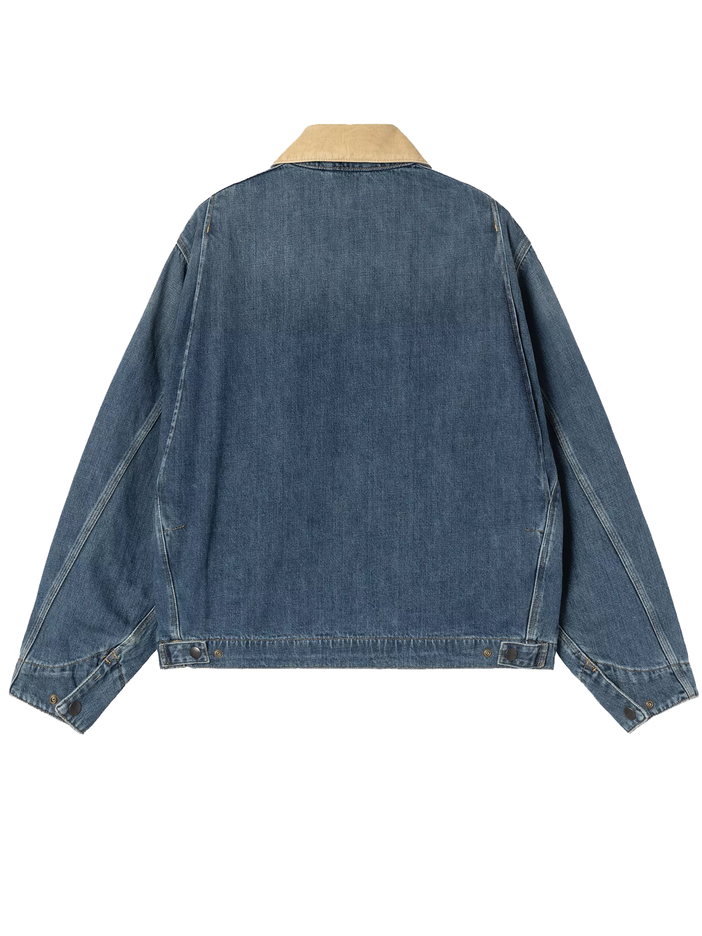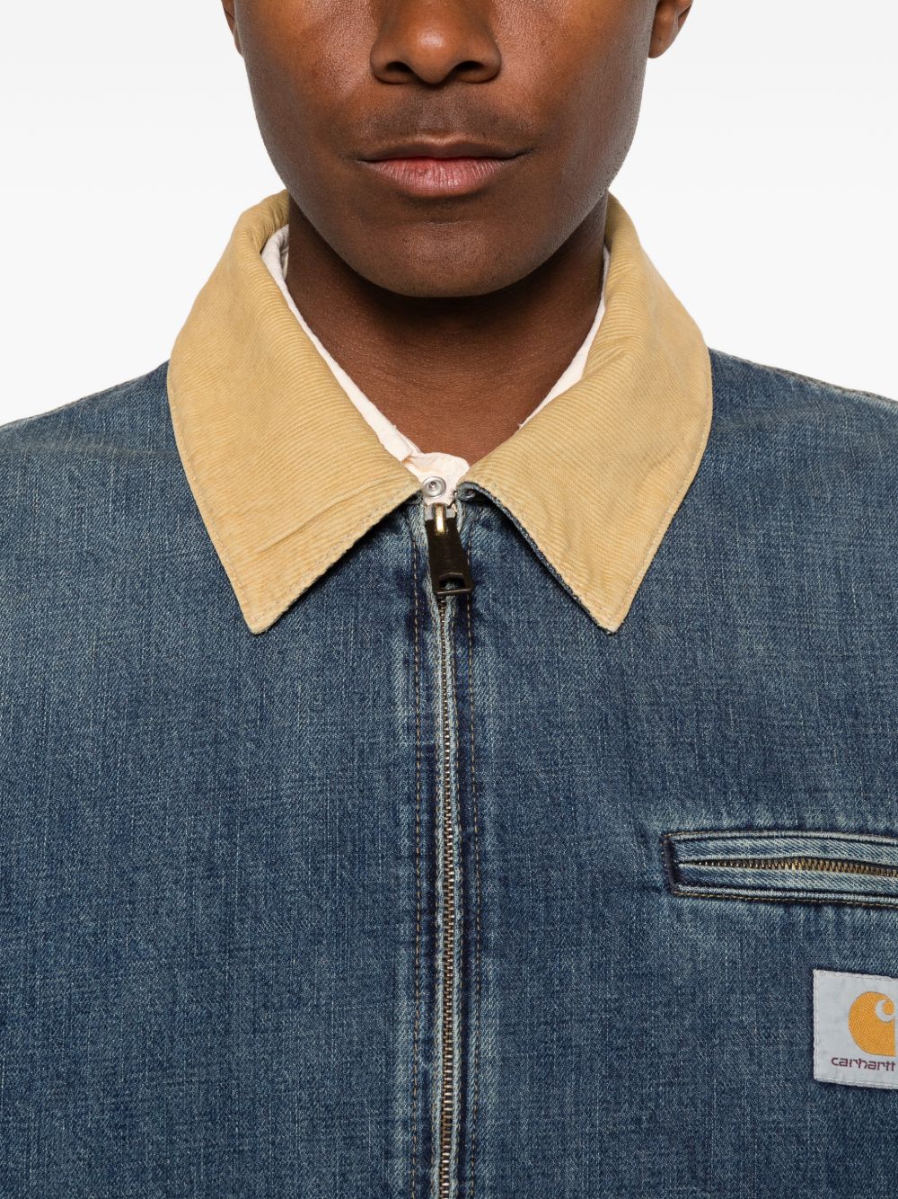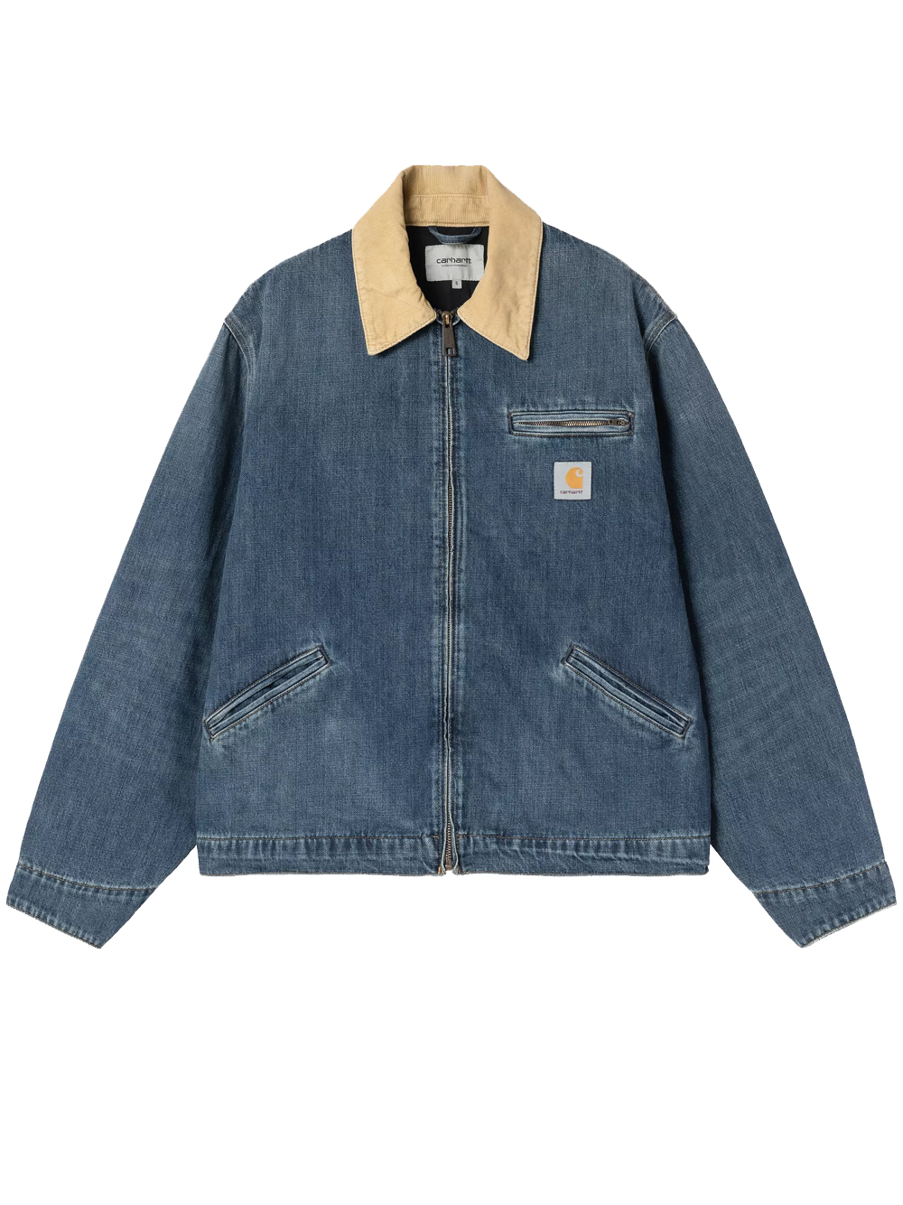 Carhartt WIP Detroit Blue OG Jacket in cotton, featuring a classic Cordura collar, front zip closure, zippered side pockets, a zippered chest pocket, and a logo patch.