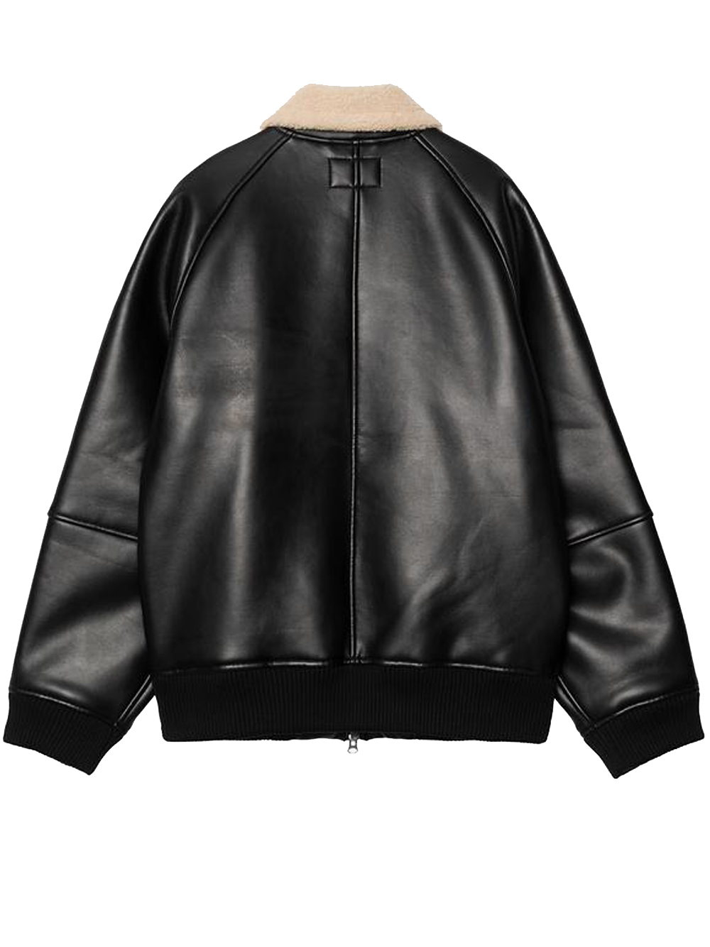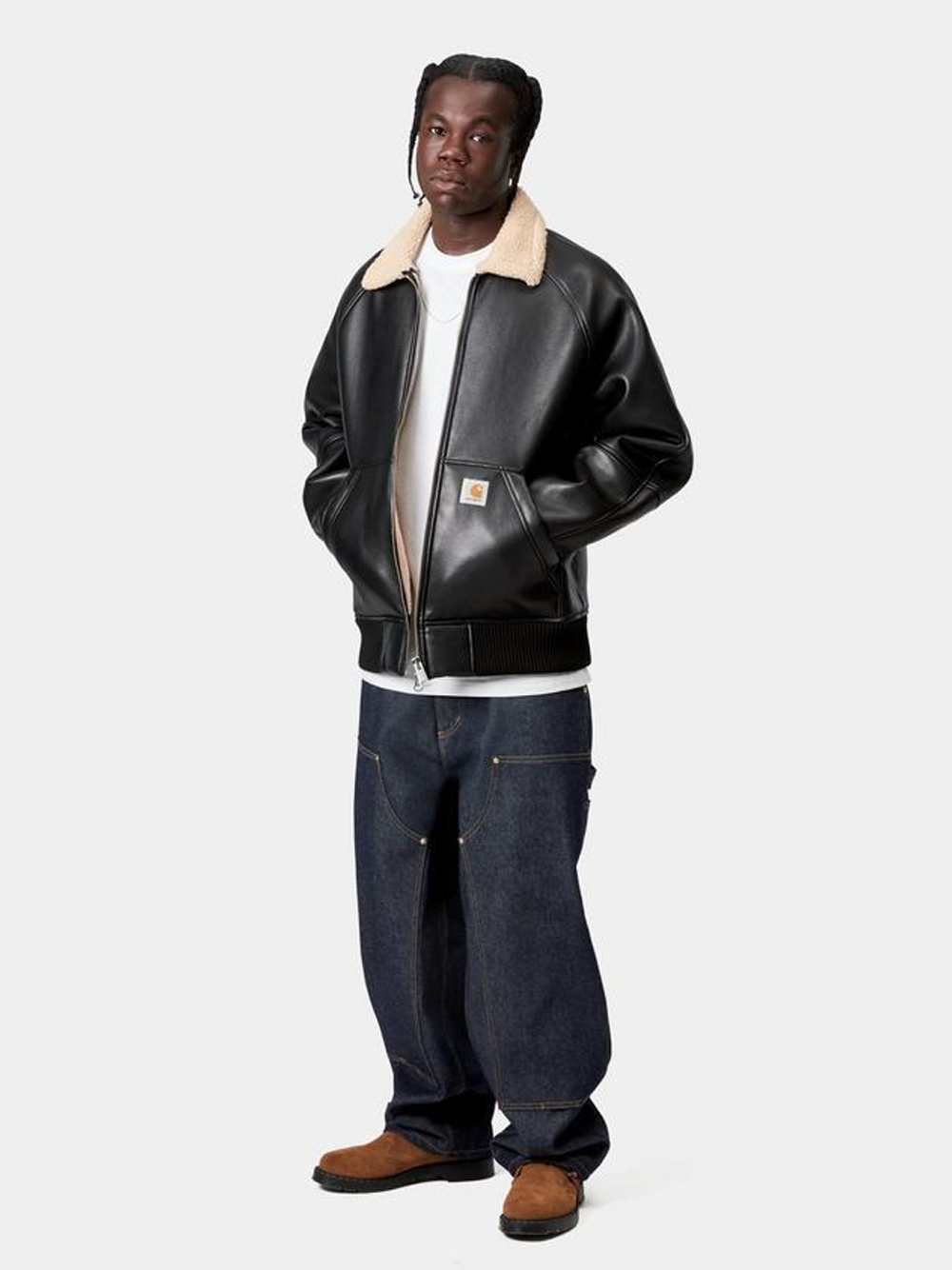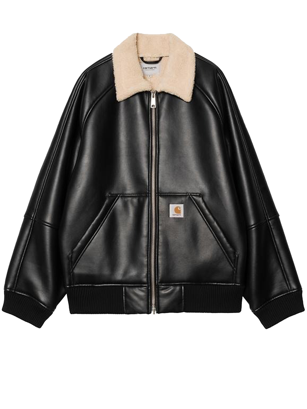 Carhartt Wip Shepton black jacket in polyurethane with synthetic fur collar and lining, double-slider zip front closure, side pockets, elasticated cuffs and hem.