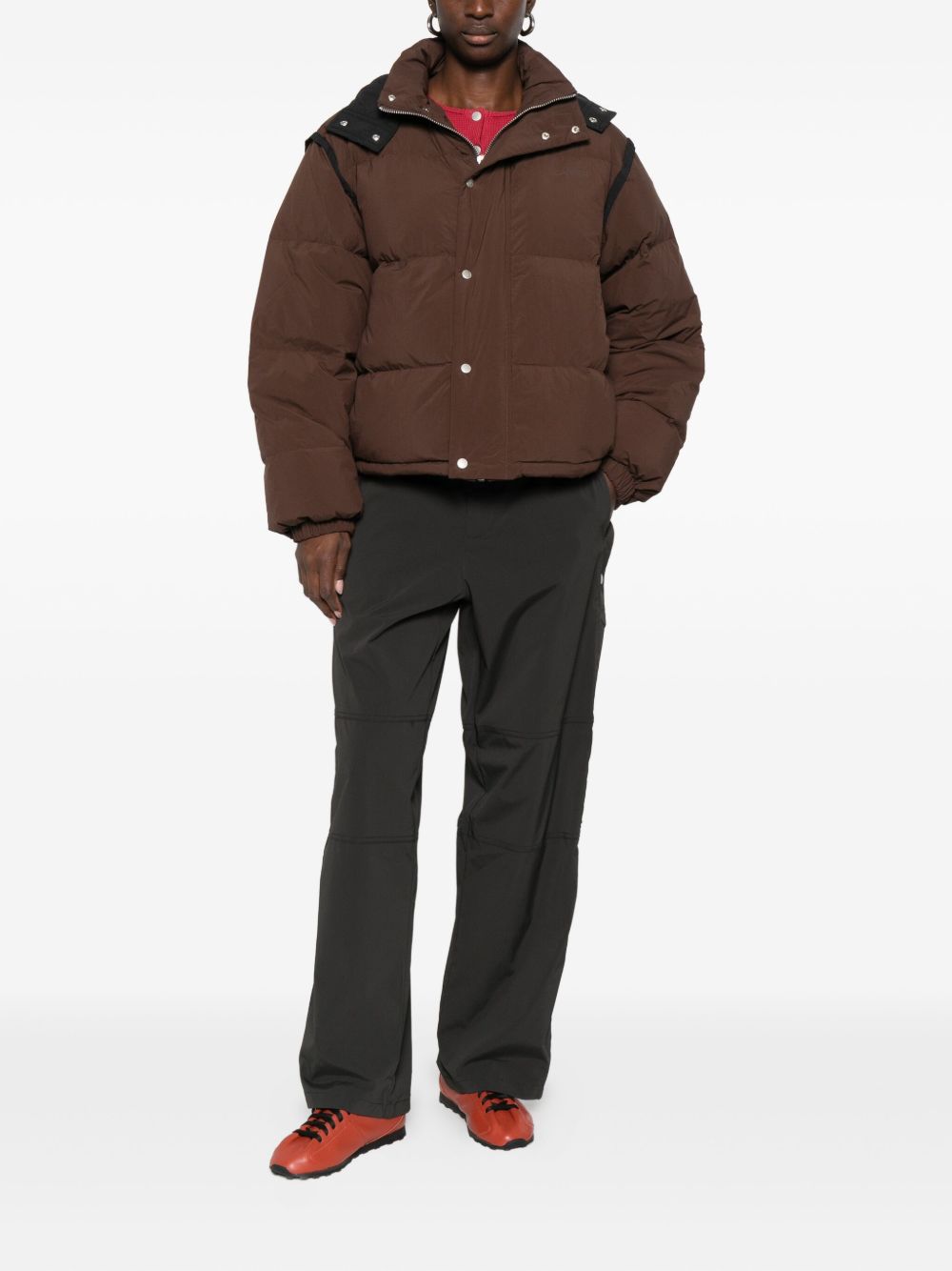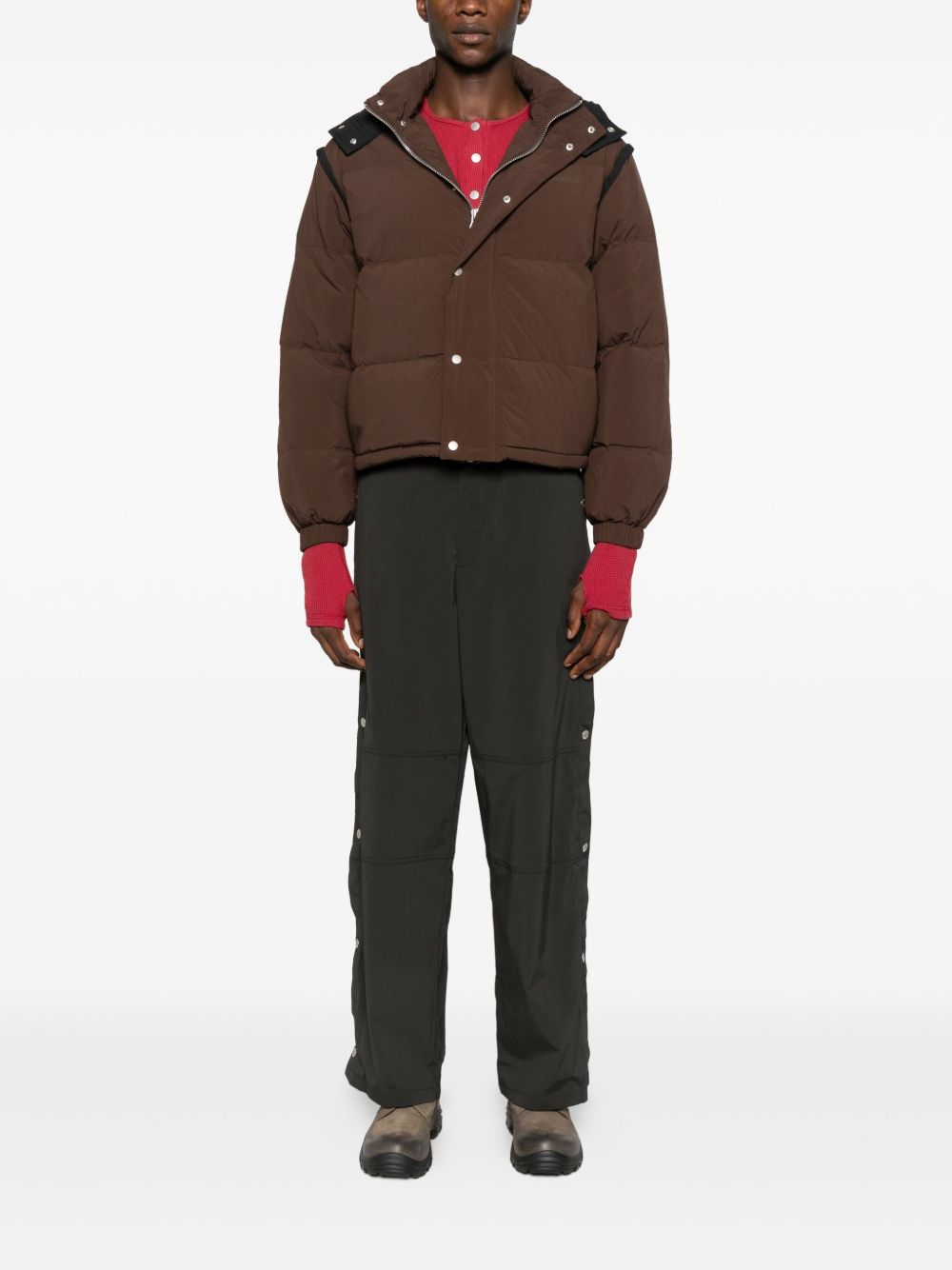 Brown Corsby jacket by Carrer in nylon with front button and zip closure, removable hood, and straight hem.