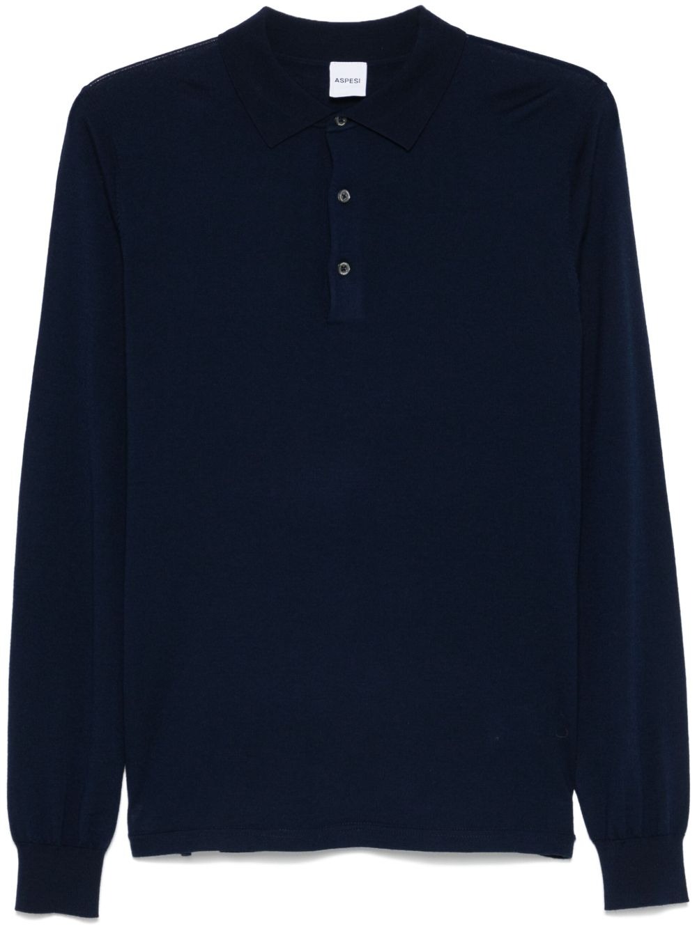 Navy wool cardigan by Comme Des Garçons Shirt with V-neck, front button closure, ribbed cuffs, and hem.