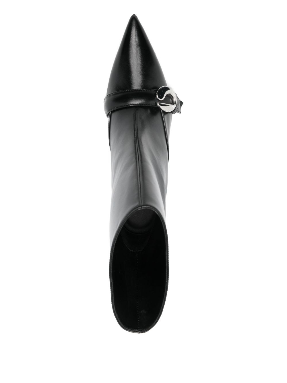 Black Ankle Heeled Belt boots by Coperni in leather with tapered toe, buckle closure, 70mm stiletto heel, ankle height.