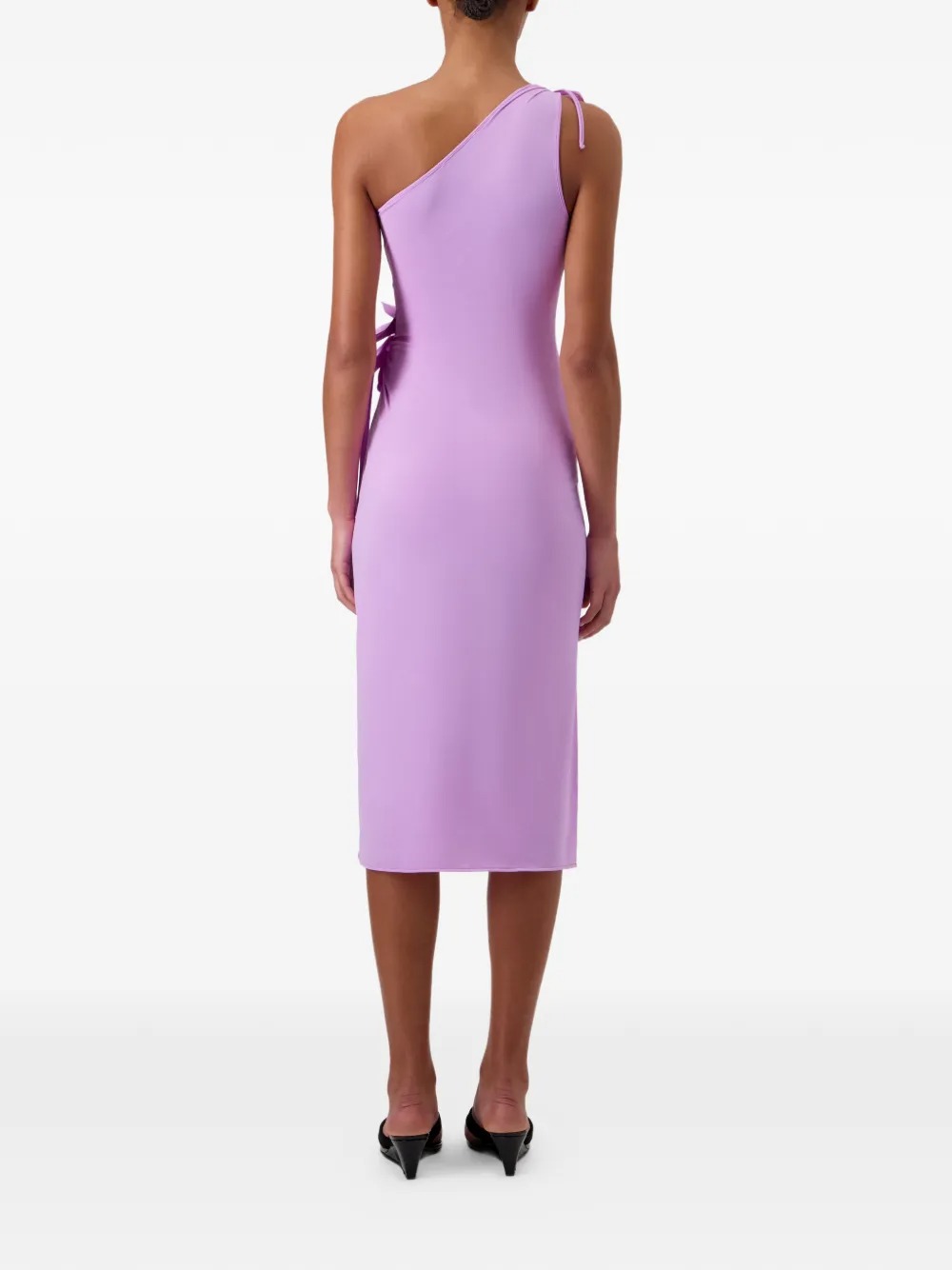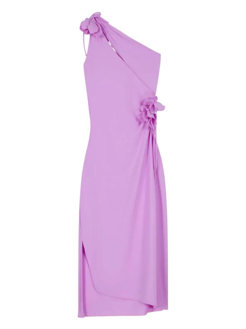 Coperni's "Asymmetric Flower Gown"--a purple mini dress made of polyamide, featuring an asymmetrical design, floral appliqué, a one-shoulder style, and sleeveless cut.