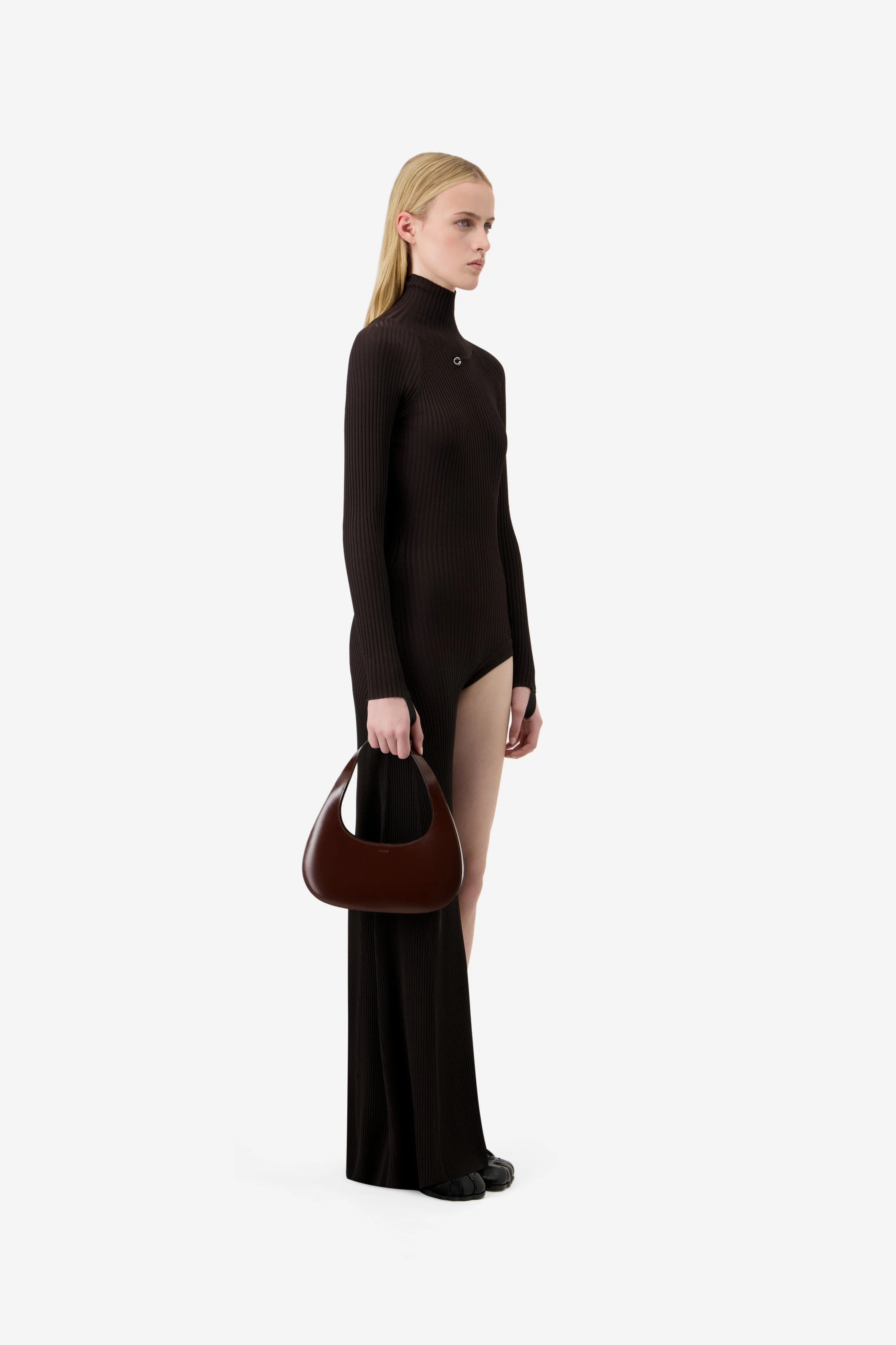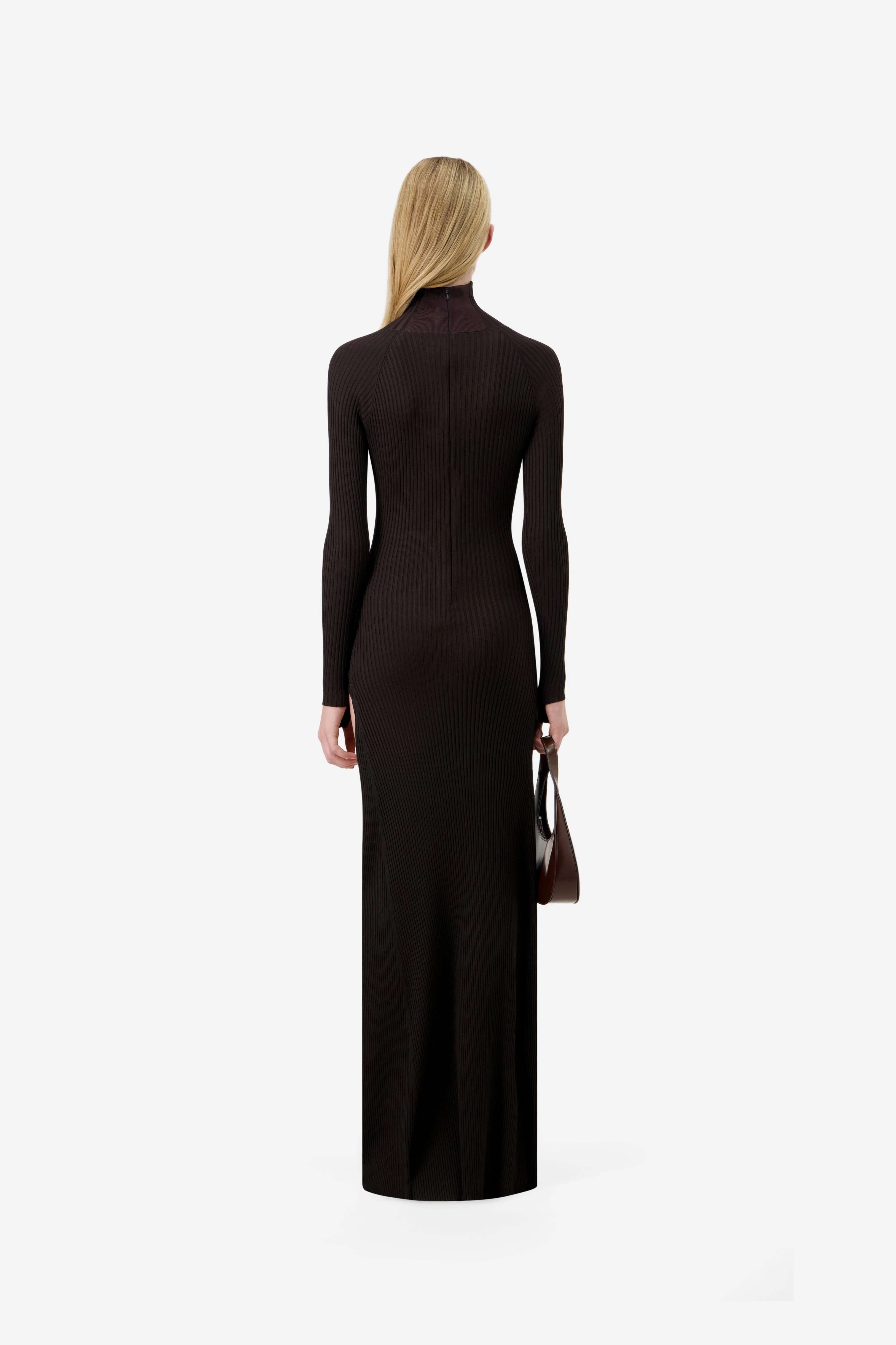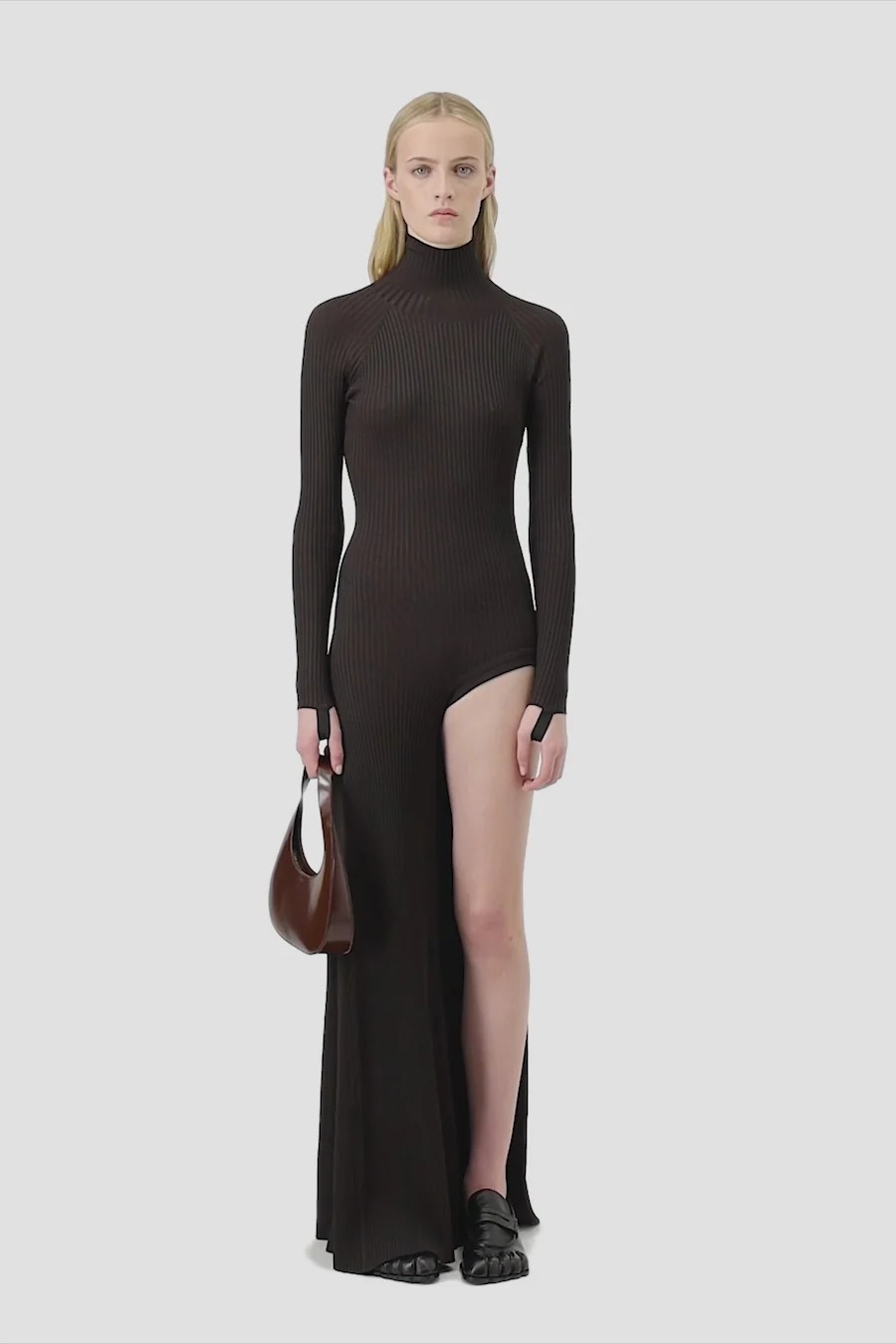 Long brown Leg Cut-Out dress by Coperni in viscose with a high neck, long sleeves, cut-out detail on the leg, ribbed weave and straight hem.