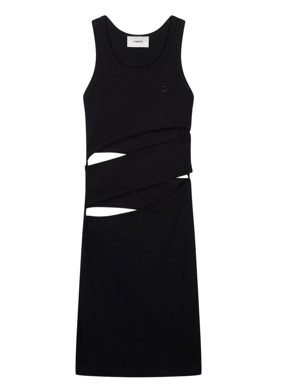Coperni Spiral white cotton dress with a ribbed design, asymmetrical cut-out details, and a crew neck