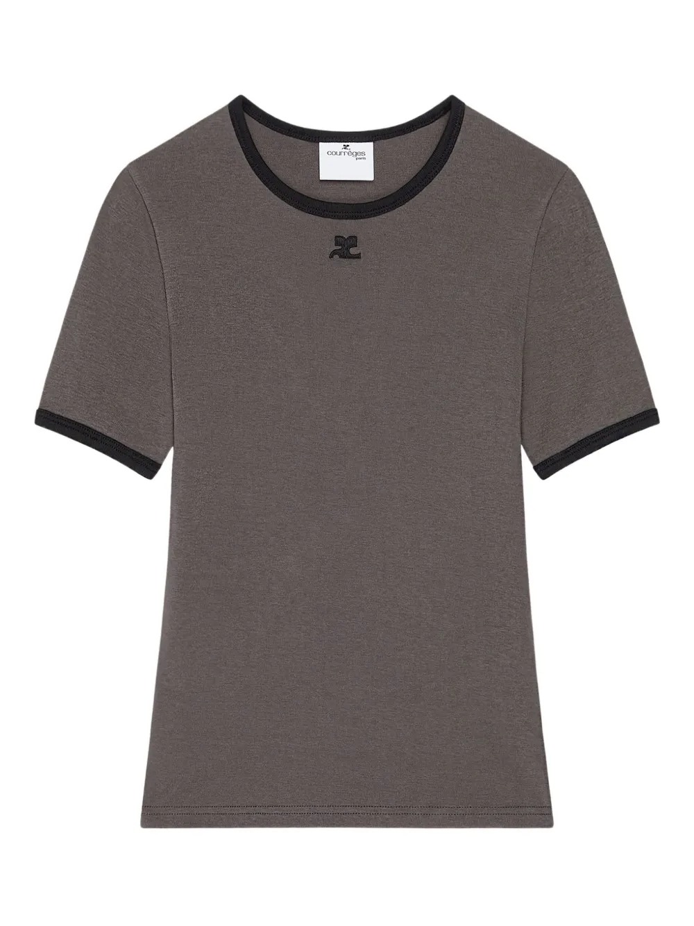 Courrèges Signature Contrast gray cotton T-shirt with logo appliqué on the front, contrasting trim, round neckline, and straight hem.