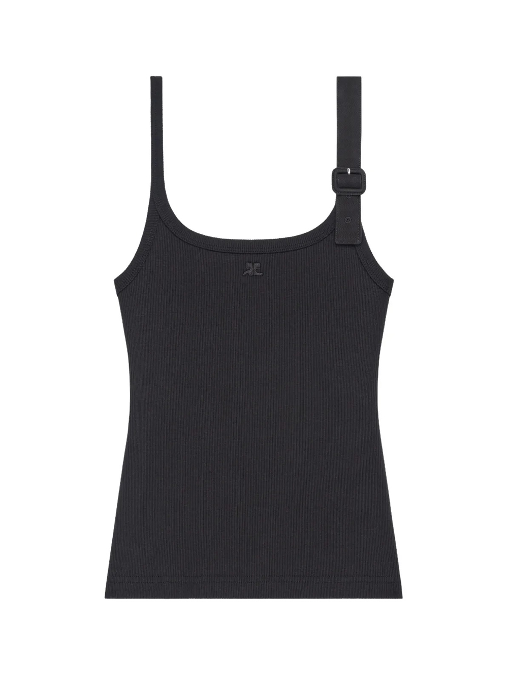 Buckle 90's black striped tank top by Courrèges, made of ribbed cotton knit, featuring a buckle detail, sleeveless, and with a square neckline.