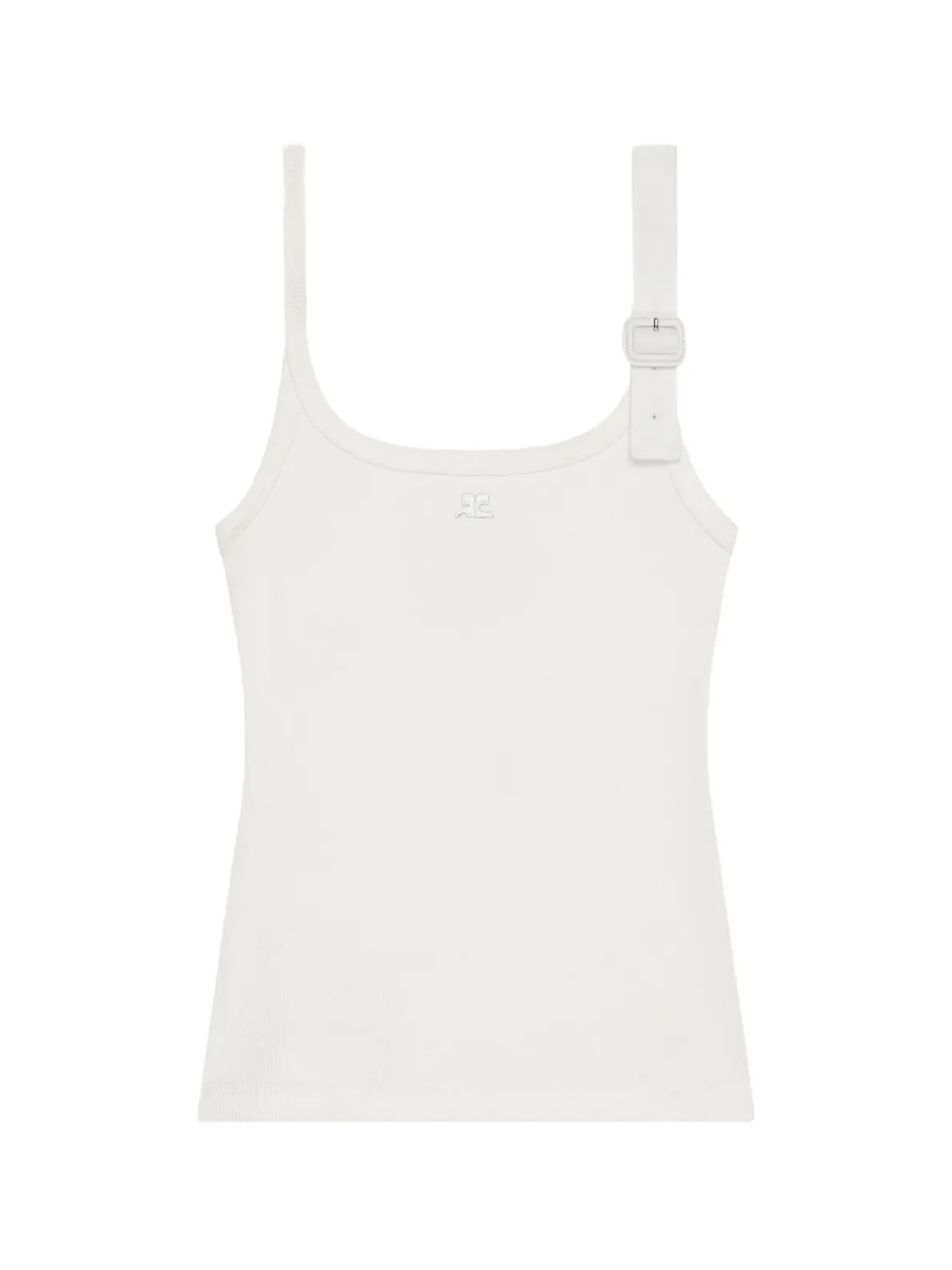 Buckle 90's white striped tank top by Courrèges, made of ribbed cotton knit, featuring a buckle detail, sleeveless, and with a square neckline.